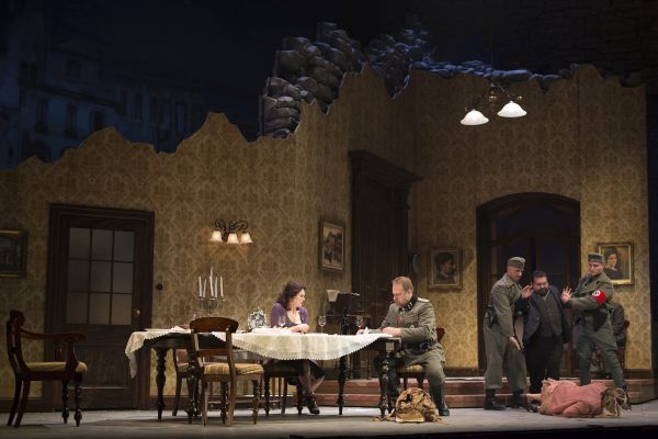 Wir haben es nicht nur hinsichtlich der Textqualität mit einer ausgezeichnet gebauten Oper zu tun, sondern auch vor allem was die Musik anbelangt. Großes Orchester, Arien, imposante Chöre, alles auf einem Niveau, das den Opernfreund glücklich macht. Ich hatte von Tutino bereits „Vita“, „Senso“ und „Le braci“ gehört und auch darüber berichtet, aber keines dieser Werke kommt an den großartigen Eindruck heran, der an diesem Abend entstand. Die Bewunderer der Darmstädter Schule und ihrer Folgen rümpfen sicherlich die Nase, aber was zählt, ist immer noch das Publikum, und das war begeistert (persönlich wäre ich am liebsten sitzen geblieben und hätte mir die Oper gleich nochmals angehört). Über Puccini und Mascagni hinaus darf man beim Hören auch an Mahler denken (prachtvoll das Intermezzo vor der letzten Szene) oder an Schostakowitsch in der skurrilen Szene eines Anwalts, der ein Kollaborateur ist, mit seiner Mutter, die von der Situation keine Ahnung hat. Es fehlt aber auch nicht das Zitat des 1943 entstandenen Liedes „Una strada nel bosco“, das durch den damals populären Bariton Gino Bechi bekannt wurde.