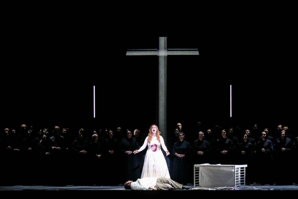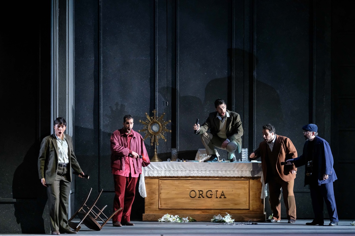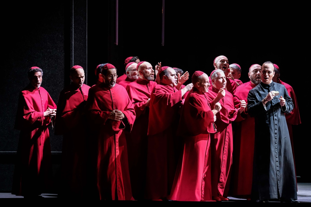 In Cagliari findet die Geschichte auf einer von Alberto Beltrame mit hohen holzvertäfelten Elementen bestückten Drehbühne statt, die sich wie Türen öffnen, geheime Gänge entstehen lassen und dabei eine düstere Atmosphäre entfalten (Licht: Marco Alba/Alberto Cannoni). Kein Tageslicht scheint in diesen düsteren Palazzo zu fallen, dafür wird allerorts flagelliert, kasteit oder gebetet. Den Hofstaat bildet folgerichtig der Klerus in typischen Gewändern, kein Traumsetting also für die Kostümbildnerin Elena Beccaro, die sich so nur im einen oder anderen Papstgewand oder bei den an die Mode der 60er Jahre angelehnten Kostümen der Revoluzzer austoben kann. Durch spannende Personenführung und vielschichtige Rückblenden (mit Com’è bello beispielsweise lässt Andrea Bernard Lucrezia in einer Erinnerung ihren neugeborenen Sohn anhimmeln) ist es dem Produktionsteam vortrefflich gelungen, die Kunstform der Oper frisch zu präsentieren und so auch einem jungen, aufgeschlossenen Publikum zugänglich zu machen.