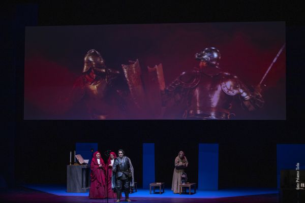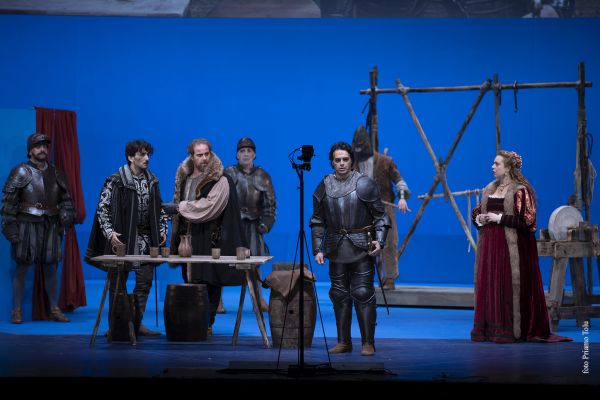 Giuseppe Grazioli, der merklich an Marinuzzi glaubt (er hat auch dessen Sinfonia in la und Suite siciliana eingespielt), leitete das Orchestra del Teatro Lirico mit sicherer Hand durch das komplizierte klangliche Gewebe und war bei aller (oft nötigen) Lautstärke den Sängern ein sorgsamer Begleiter, der sie nie zudeckte. In der Titelrolle war der kraftvolle Bariton des Elia Fabbian zu hören, der Pallas herrischem Auftreten den nötigen Nachdruck verlieh, aber auch als durch den Verrat des Sohns gebrochener Vater beeindruckte. Signorello war Leonardo Caimi anvertraut, der dem Typ des vom brutalen Soldatenleben abgestoßenen Jünglings bestens entsprach. Einer angenehm timbrierten Mittellage seines Tenors stand ein forciertes Höhenregister gegenüber, das Caimi aber unter Kontrolle hatte. Mit der Interpretation der Anna Bianca erwies sich Francesca Tiburzi als die gesanglich beste der drei Protagonisten. Sie kam in ihrem großen Ausbruch im 3. Akt mit glanzvollem Sopran mühelos über das Orchester. Szenisch litt sie unter der Regie, doch davon später. Als Herr von Montelabro beeindruckte Francesco Verna in einer relativ kurzen, aber für einen Bariton unangenehm hoch liegenden Rolle. Die vier verräterischen Hauptleute wurden von Andrea Galli (Il Mancino, Tenor), Murat Can Güvem (Giomo, Tenor), Matteo Loi (Spadaccia, Bariton) und Luca Dall’Amico (Niccolò, Basso) bestens interpretiert. Cristian Saitta (Bass) donnerte den Bischof, Giuseppe Raimondo (Tenor) gab den getreuen Straccaguerra, Alessandro Busi (Bass) den Anführer der Landsknechte, der für Signorellos Hinrichtung stimmt, und schließlich Elena Schirru (Sopran) und Lara Rotili (Mezzo) als zwei verängstigte Nonnen. Der Chor des Hauses unter der Leitung von Donato Sivo sang kraftvoll und ausgewogen (wobei die Herren mehr gefordert waren als die Damen).