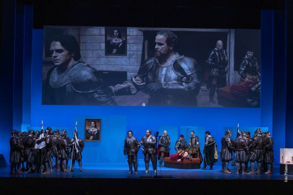 Doch nun zur bitteren Pille, der Produktion. Giorgio Barberio Corsetti und Pierrick Sorin setzten auf den Einsatz filmischer Mittel. An sich keine Neuheit, wird doch ein Gutteil heutiger Operninszenierungen um mehr oder weniger um Videoeinspielungen „bereichert“. Hier ging man allerdings ins Extrem: Am Bühnenrand stand jeweils das Modell eines Bühnenbilds, das von einer in der Rampenmitte postierten Kamera zusammen mit den Sängern gefilmt und auf eine Leinwand projiziert wurde. Das mochte manch farblich erfreuliche, an Renaissancemalereien gemahnende Wirkungen ergeben, aber zu welchem Preis? Dieser war hoch, denn um die erwähnten Farbeffekte zu erzielen, musste sich in der Bühnentiefe eine hellblaue Wand befinden und sonst – genau nichts. Vermochten die historisch treuen Kostüme von Francesco Esposito zu gefallen, so war es doch befremdlich, dass sich sämtliche Nonnen in roten Gewändern zeigten, was vermutlich wieder auf Notwendigkeiten der Kamera zurückzuführen ist. Angesichts all dieser Technik gab es praktisch keine Personenführung, im Gegenteil war zum Beispiel die Szene, in der die vier Hauptleute Anna Bianca als ihre Beute belästigen, nur peinlich und hätte laut Libretto sogar komisch sein sollen. (Die Stelle ließ allerdings auch musikalisch mit Wehmut an das Schmugglerquintett im 2. Akt „Carmen“ denken). Der Soldatenchor schüttelte im Gleichklang die Fäuste – hier und an zahlreichen anderen Stellen wurde leider Stadttheaterniveau unterboten. Das Schlimmste war aber, dass ein Mime hinzugezogen worden war: Julien Lambert wird im Programmheft als „Schauspieler und Akrobat“ ausgewiesen. Wuselte er im 1. Akt noch als irgendwie akzeptabler Mönch herum, so störte er als grotesker „Raubritter“ den 2. entschieden, ganz zu schweigen vom 3., wo er einen lustigen (?) Scharfrichter mimte. Seine peinlichen Auftritte waren häufig während längerer symphonischer Passagen vorgesehen, was bestätigt, dass sich die Regisseure ein auch ohne „action“ aufmerksam lauschendes Publikum gar nicht mehr vorstellen können. Ein Armutszeugnis!