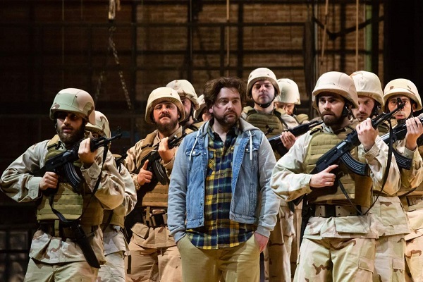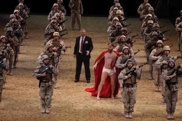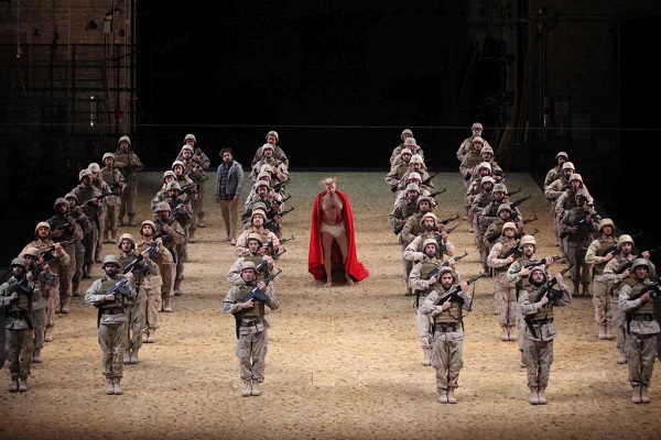 Kurioserweise – nach heutigen Inszenierungsusancen – geht zu Beginn des Vorspiels erst mal der Vorgang runter. Was dann kommt, ist zunächst kaum verständlich: Eine Truppe von US-amerikanischen GIs mit MGs im Anschlag kommt als Gralsritter und später gesamter Chor, während Amfortas im purpurnen Königsumhang, nur mit Lendenschurz bekleidet, schwerst leidend und aus der Wunde blutend mit Dornenkrone durch ihre Reihen robbt. Für die ungewohnten Kostüme – Parsifal dabei barfuß in banaler Straßenkleidung – zeichnete Mauro Tinti verantwortlich. Die Gralserhebung – in einer weißen Kaffeetasse, die er aus dem Boden in einem Sackerl hervorkramt (!), wird zu einer Szene blutiger Selbstverstümmelung. Denn nach dem Genuss des Blutes ritzen sich alle GIs alias „Ritter“ die Arme und manche auch beseelt die Stirn auf… Manche kommen mit den Druckverhältnissen im Blutschlauch auf den Messern nicht klar und bleiben (fast) trocken… Dass Titurel trotz seiner generalstabsmäßigen Ordens-Staffage auf der Brust in einem simplen grauen Business-Anzug aufkreuzt, bleibt ebenso kurios. Man hatte den Eindruck, es sollte von allem – sozusagen auf „Teufel komm‘ raus“ – etwas sein… Giuseppe Di Iorio war zwar für das Licht zuständig, hatte aber in dieser Hinsicht fast nichts zu tun.
