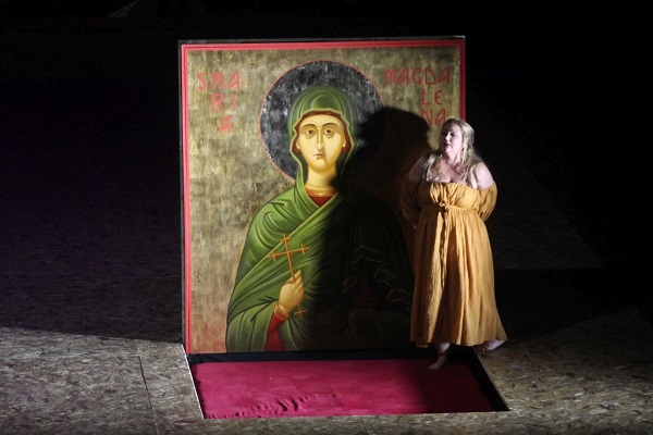 Dann einmal mehr ein Gruß an den Islam, denn kaum sind die Zaubermädchen verführerisch gekleidet aufgekreuzt, vermummen sich die meisten auch schon wieder im schwarzen Tschador, ein immer wieder gern gewählter Topos (z.B. Mielitz in Wien, Laufenberg in Bayreuth et al.) einer allerdings auch viel sublimer möglichen Referenz an den Islam in Wagners Bühnenweihfestspiel. Die Choreografie der tanzenden Mädchen ist jedoch sehr einfallsreich und dynamisch, attraktiv bis sexy auch ihre sommerlichen Kostüme. Beim Dialog zwischen Kundry und Parsifal steigt vorn eine riesige goldene Ikone auf, sicher eine Referenz an die beiden oben genannten Kirchen, die das Bildnis der Maria Magdalena zeigt (also Kundry!) und auch eine akustische Unterstützung bietet, die den Sängern bei Vick in dieser Produktion meist nicht zuteilwurde. Im Gegenzug zur Charakterisierung Kundrys als M. Magdalena kann man wohl Parsifals ostentative Geste des Erlösers am Kreuz genau bei ihrem „Und lachte!“ interpretieren – eine durchaus interessante Idee! Eindrucksvoll und mit einer gewissen Dynamik gelingt auch die „Speerübergabe“, indem Klingsor die Waffe schnell über drei Schergen reichen lässt und der letzte vor Parsifals Macht erstarrt, der ihn dann ruhig entgegen nimmt.
