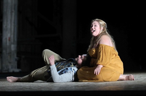 So ist nur mit einiger Fantasie nachzuvollziehen, dass bei Klingsors Ruf nach seinen Rittern im 2. Aufzug die GIs, nun austauschbar bei ihm wie in einer Fremdenlegion im Dienst, halbnackt über die Bühne huschen, natürlich in den nicht nur von Vick auf den heutigen Theater- und Opernbühnen so begehrten weißen Unterhosen. Denn sie haben es offenbar gerade noch mit den Blumenmädchen getrieben. Dabei begann der 2. Aufzug denkbar spartanisch: Auf einem alten Bühnenstuhl sitzt Klingsor oben ohne mit dem Rücken zum Publikum, stark an einer Havanna rauchend, am Boden wie ein Hund die verhüllte Kundry, der Speer im Boden steckend auf der anderen Seite. Natürlich muss auch er bald die Hose runterlassen, denn man soll ja den Blutfleck an der Stelle sehen, wo er sich – offenbar erst kurz zuvor – entmannt hat, wohl ein Zeitraffer. Dass er dann fast den gesamten Rest seines Auftritts mit der Hose am Boden herumstraucheln muss, trägt nicht unbedingt zur Ernsthaftigkeit dieser doch bösen Figur bei, wie sie sich in der Musik abbildet, aber optisch wohl nicht zeigen darf… Bei Vera Nemirovas „Rheingold“ in Frankfurt/Main muss auch der Alberich mit runtergelassener Hose agieren. Scheinbar wird auch das nun langsam zu einem – allerdings ebenso fantasielosen wie unpassenden – postmodernen Stereotyp…