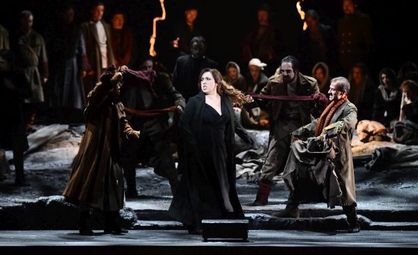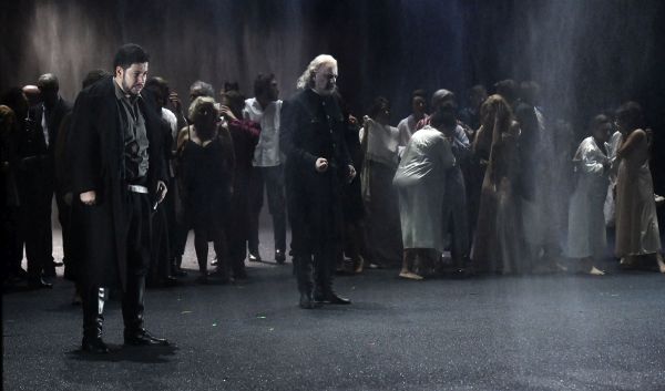 Als Koproduktion mit der Staatsoper Plovdiv (der europäischen Kulturhauptstadt 2019) entstanden, ist dem Regisseur und Bühnenbildner Andrea De Rosa dafür zu danken, dass er eine im besten Sinne konservative Auslegung des Werks auf die Bühne gestellt hat. Sogar die Szene während der Ouverture, in der sich eine von den Hunnen verfolgte Familie in ein Erdloch flüchtet, ist sinnvoll, endet doch Attila nach seiner Ermordung durch Odabella ebendort. Dass der Regisseur den Protagonisten eine um Gnade flehende Frau heimtückisch erstechen lässt, steht allerdings im Gegensatz zu Verdis Wollen, der uns den Hunnenkönig in recht menschlichen Dimensionen zeigt. Auch entspricht sein Kostüm mit Gilet, Taschenuhr und Mantel im Stil des ausgehenden 19. Jahrhunderts keineswegs einem Barbarenfürsten. Überhaupt sind die Kostüme von Alessandro Lai recht widersprüchlich, denn der Römer Ezio trägt eine modern anmutende schwarze Uniform, die zwei ihn begleitenden Senatoren hingegen jeweils eine schön drapierte Toga, während die Kostüme von Odabella und ihrem geliebten Foresto zeitlich nicht zuzuordnen sind. Abgesehen davon ist die Produktion aber sehr eindrucksvoll, wenn zum Beispiel beim Eintreffen der Hunnen eine große Mauer auseinanderbricht oder Papst Leo in einem Behälter auftritt, der so geschickt gemacht ist, dass die Figur überdimensional groß erscheinen muss. Die Beleuchtung durch Pasquale Mari tat ein übriges, um die dunkle Stimmung des Werks zu unterstreichen.
