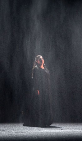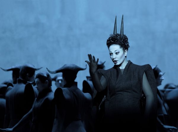 Der Programmzettel zeigt nicht an, wer das Bühnenbild erstellt hat, das es tatsächlich praktisch nicht gibt. Regisseur Daniele Abbado setzt zur Gänze auf Lichteffekte (Angelo Linzalata) und die Schaffung von nebelartigen Effekten durch die Verteilung von Feuchtigkeit. Sängerfreundlich ist das nicht, denn die Künstler mussten, sobald sie die Bühne verlassen hatten, von ihren Betreuern flugs abgetrocknet werden, um sich nicht zu verkühlen! So blieb diese Regie auf das Ambiente fixiert, ohne die Charaktere der Protagonisten besonders herauszuarbeiten. Zeigten sich die Hexen zu Beginn noch leidlich überzeugend, so wurden sie bei ihrer zweiten Anrufung von einer bunt gekleideten Truppe teils abstruser Monster verkörpert (Choreographie: Simona Bucci). Die Kostüme von Carla Teti beeindruckten für das Volk, waren in ihrem bürgerlichen Habitus aber keine Hilfe für die Protagonisten.