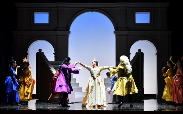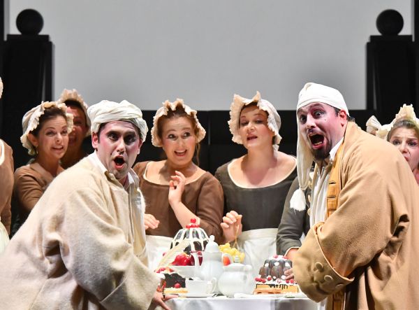 In der Tat ist die Oper von unterschiedlicher Qualität, schwankend zwischen kopiertem Rossinistil und schwungvollen Einfällen Marke „Eigenbau“, doch lässt beides sich gut hören, um so mehr als in Busseto die Produktion wiederbelebt wurde, die Pier Luigi Pizzi 1997 für Parma geschaffen hatte und die 2001 auch an der Scala mit den Studenten der Accademia zu sehen war. Nun war Massimo Gasparon für Regie, Bühnenbild, Kostüme und Beleuchtung zuständig, aber mit Ausnahme einiger kleinerer Vergröberungen, die sich vor allem im Austeilen von Püffen manifestierten, blieben Pizzis unterhaltsame Ideen bestehen. So spielt etwa, als Reverenz vor Parma, eine Szene in einer mit einladenden Schinken behängten Küche, eine andere lässt die Marchesa del Poggio, die Geliebte Belfiores und somit des falschen Stanislao, in ihrer großen Auftrittsszene ein Bad nehmen.
