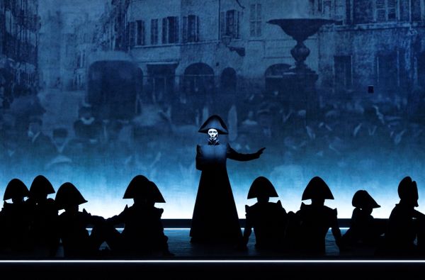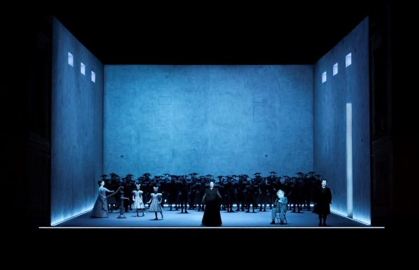 Sei dem, wie ihm wolle, die Erbsünde dieser Produktion liegt darin, dass die Regie Robert Wilson anvertraut wurde. Wer seit gut 35 Jahren die statische, auf steife Gesten beruhende Arbeit dieses Künstlers kennt, dem ist klar, dass die Kombination Verdi-Wilson ein Widerspruch in sich selbst ist. Wie üblich gab es keinerlei Beziehung zwischen den Protagonisten, denn Wilson, der sich im Programmheft einmal mehr rühmt, die „Spannung zwischen voran eilender Musik und langsamen Gesten zu schaffen“, will sich nicht einen Deut mit der musikalischen Vorgabe beschäftigen. Zusätzlich zum üblichen Personal gibt es einen alten Herrn, den man zunächst als den alten Grafen Luna deuten möchte, der bis zum Ballett (davon später) auf der Bühne bleibt, dann aber weggetragen wird und für immer verschwindet. In der Szene Manrique/Azucena geistert eine Dame mit zwei Mädchen herum, wobei die Haltung aller drei in der Nähe einer altertümlichen Pumpe erstarrt. Es gibt auch eine alte Dame mit Kinderwagen (meinetwegen die Amme des kleinen Luna), doch schwingt sie im Ballett dann das Tanzbein.