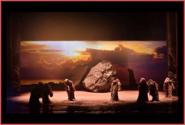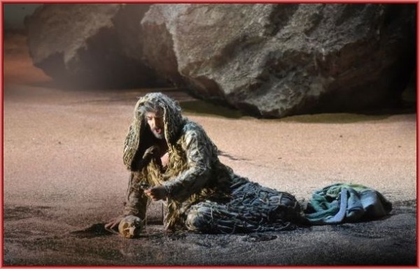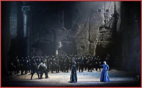Für die im Rahmen des Verdifestivals stattfindende Produktion hatte man Hugo De Ana als Regisseur und Ausstatter verpflichtet, dessen Arbeit perfekt zur großen Oper passt. So waren neben historisch inspirierten Kostümen vor allem auch prachtvolle Bühnenbilder zu sehen, die die Stimmung des frühen Mittelalters ebenso wiederzugeben vermochten, wie die einer sonnverbrannten Wüste. Dazu kamen die passende Beleuchtung durch Valerio Alfieri und sparsame, aber eindrucksvolle Projektionen (etwa eines mittelalterlichen Kirchenfensters) von Ideogamma-Sergio Metalli. Einzig die Choreographie des – für Pariser Produktionen damals unerlässlichen – Balletts durch Leda Lojodice fiel ideenarm aus, aber an die Dame muss man sich in De Anas Fahrwasser halt gewöhnen.