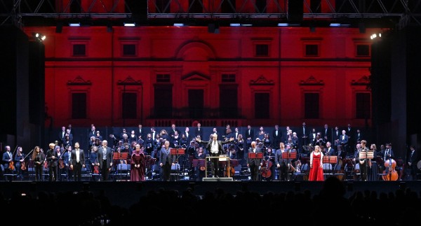 Vor dem Palazzo Ducale wurde eine Bühne errichtet, die größenmäßig alle Stück’ln spielt, denn darauf findet das Orchester Filarmonica Arturo Toscanini bequem Platz, dahinter der Chor, mit der beleuchteten Fassade des Palazzo im Hintergrund. Die geschickte Anordnung ermöglicht, dass die Klangverstärkung absolut minimal und diskret bleibt, was ich an den Stimmen, die mir fast alle bekannt waren, beobachten konnte.