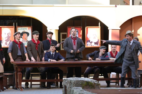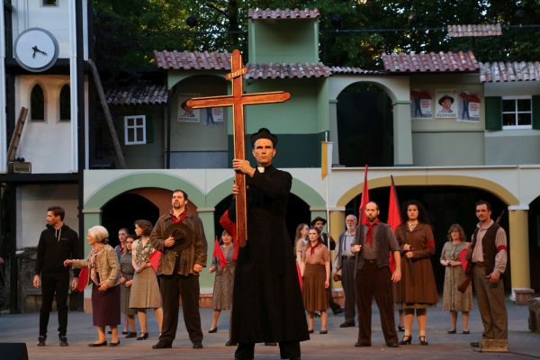 So ist auch die diesjährige erste große Premiere (nach dem liebevoll gestalteten Kinderstück „Das Dschungelbuch“) ein großer Erfolg. Als erstes Theater in Deutschland konnte man sich von den Vereinigten Bühnen Wien die Aufführungsrechte für das Musical „Don Camillo & Peppone“ sichern. Basierend auf den Romanen von Giovannino Guareschi und vor allem bekannt durch die Filme der 50er-Jahre wird hier die Geschichte des kleinen italienischen Dorfes Boscaccio erzählt, in dem sich kurz nach dem 2. Weltkrieg der neu gewählte kommunistische Bürgermeister Peppone und der katholische Dorfpfarrer Don Camillo das ein oder andere Gefecht liefern. Erzählt wird uns diese Zeitreise durch die alte Gina, die den Zuschauer mitnimmt in Ihre Gedanken an früher. Dies setzt Regisseur Andreas Gergen, der bereits die Originalinszenierung in St. Gallen und Wien schuf, ganz bezaubernd für die große Freilichtbühne um. Dabei verzeiht man auch gerne, dass er an einer Stelle etwas bei sich selbst abgeschaut hat, erinnert die Suche mit den Taschenlampen nach dem vermissten Liebespaar doch sehr stark an Rebecca vor zwei Jahren. Allerdings ist dieser Effekt auf der großen Bühne auch nach wie vor sehr sehenswert. Fast schon genial zudem, wie es Herrn Gergen am Ende gelingt, ohne mit dem erhobenen Zeigefinger deutlich zu machen, wie wichtig es ist, dass man Werte wie die europäische Union schätzt, was im Alltag oft untergeht. Großes Lob hier auch an die Lichtabteilung, die mit für dieses sehr eindrucksvolle Finale sorgt. Allgemein lassen sich viele kleine Botschaften aus diesem Werk gut in die heutige Zeit übertragen, hier hat man bei der Programmplanung für diese Spielzeit das richtige Werk zur richtigen Zeit ausgewählt.
