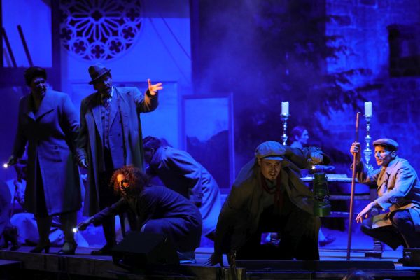 Thomas Borchert versucht sich hierbei immer wieder im Zwiegespräch mit Jesus (der in dieser Produktion durch Florian Albers sichtbar auf die Bühne gebracht wird) für seine Schwindeleien zu rechtfertigen und Patrick Stanke wächst als Peppone nach und nach in sein nicht einfaches Bürgermeisteramt hinein. Trotz diverser Differenzen, die auch schon mal in einer kleinen Prügelei im Glockenturm ausgetragen werden, wollen doch beide nur das Beste für das Dorf in dem sie leben. Im Laufe des Stückes erkennen sie, dass sie vielleicht gar nicht so verschieden sind, wie es zu Beginn scheint. Was die beiden Darsteller hier in Sachen Zusammenspiel und perfektem Timing zeigen sucht durchaus seines Gleichen. Die alte Gina wird von Barbara Tartaglia verkörpert, die diese Rolle auch bereits in der Schweiz und in Österreich besetzte. Gleich zu Beginn mit „Lang ist es her“ sorgt sie für den ersten kleinen Gänsehautmoment. Sehr stark auch immer wieder die Szenen, in denen sie voller Wehmut aber durchaus glücklich auf die junge Gina schaut. Auch die übrige Besetzung ist ebenso namhaft wie treffend besetzt: Milica Jovanovic als junge Gina, Dominik Hees als sie liebender Mariolino, Kevin Tarte als Ginas Vater, Jörg Neubauer als Mariolinos Vater, Femke Soetenga als Lehrerin Laura Castelli und Jan Altenbockum als Dorfarzt. Für besonders humorvolle Einlagen sorgt auch immer wieder Sebastian Brandmeir als Ginas Großvater Nonno, der sich in Laura verliebt hat und somit noch nicht bereit ist das Zeitliche zu segnen. Dazu gesellt sich ein großartiges Ensemble, so dass sich besonders die großen Gruppenszenen bei „Regen, Regen, Regen“ oder „Wunder geschehn“ trotz der großen Bühne wunderbar entfalten können. Hier sorgen auch die gelungenen Choreografien von Till Nau zum stimmigen Gesamtbild. Als Bühne schuf Jens Janke eine große Piazza, die durch die Häuserreihe des Dorfes abgeschlossen wird. Hinter einem Brunnen befindet sich zudem das Innere der Kirche, bei der das große Fenster im Laufe des Abends oft stimmig beleuchtet ist. Die Kostüme wurden von Karin Alberti passend der Zeit gestaltet.