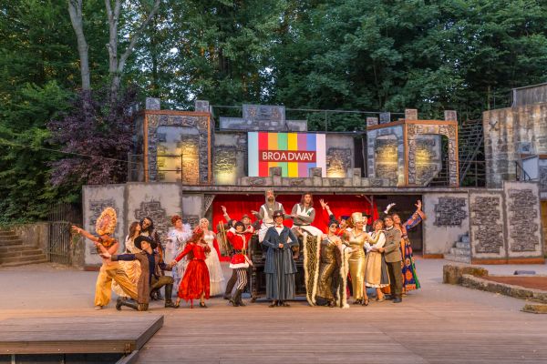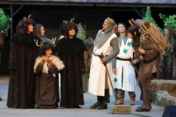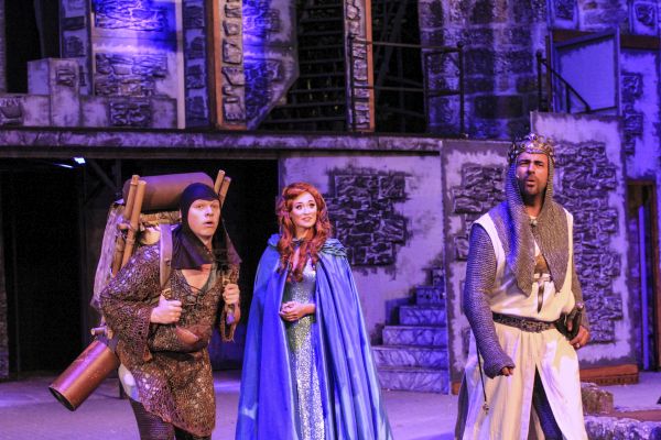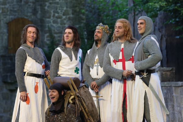 In den letzten Jahren fand sich das Stück auf unzähligen Stadttheaterbühnen wieder, man könnte es fast als das Musical der Stunde bezeichnen. Warum nun also weit bis Tecklenburg reisen, könnte man sich fragen. Die Antwort ist einfach, denn man hat hier wie üblich ein wirklich hervorragendes Ensemble zusammengestellt, was bei diesem Werk äußerst wichtig ist und oftmals den Unterschied ausmacht, zwischen einfachem Nachspielen einiger Gags und einem wirklich hinreißenden Musicalabend mit allem was dazu gehört. Frank Winkels gibt den König Artus in all seiner Tollpatschigkeit und mit toller Stimme in den Gesangsparts. Seinen mit Kokosnüssen klappernden Diener Patsy übernimmt Robert Meyer, der u. a. zu Beginn des zweiten Aktes unter starkem Beifall das Lied „Nimm das Leben beschwingt, hab einfach Spaß!“ („Always Look an the bright side of Life“) vortragen darf. Im Übrigen wird das komplette Musical auch in Tecklenburg in der gelungen deutschen Übersetzung von Daniel Grosse Boymann aufgeführt. Als Fee aus dem See zeigt Femke Soetenga eine ebenso gute Leistung wie Thomas Hohler als etwas ängstlicher Sir Robin, Florian Soyka als Sir Galahad (wunderbar auch seine Wandlung vom autonomen Dennis zum Ritter Galahad) und Gerben Grimmius als Sir Bedevere. Mathias Meffert wagt als Sir Lancelot ein großes Coming Out, was in Kombination mit Nicolai Schwab als Prinz Herbert als eines der großen Highlights des Abends im Gedächtnis bleibt. Jan Altenbockum gibt einen souveränen Erzähler und darf gesanglich als „noch nicht toter“ Fred überzeugen. Lobenswert auch das große Ensemble, welches hervorragend integriert wurde.