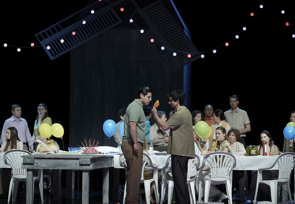Ein junger, unschuldiger Teenager verliebt sich in einen emotional abgebrühten Außenseiter und der bereut Jahre später die brüske Zurückweisung. So schlicht lässt sich Alexander Puschkins Versroman aus dem Jahr 1833 zusammenfassen. Onegin tötet in dessen Verlauf sogar seinen einzigen Freund in einem Duell, das der wegen einer Lappalie vom Zaun gebrochen hat und das schon in der Vorlage und ebenso in der gut 50 Jahre später entstandenen Oper an einer Mühle am See stattfindet. Deshalb wählt Ausstatterin Clara Hertel genau diese Szenerie für ihr Einheitsbühnenbild, lässt See und Mühle durch die Jahreszeiten wandern – vom Früh- über Spätsommer bis hin zum eisigen Winter, auf dem Eiskunstläuferinnen und Sängerpersonal auf der Bühne Pirouetten drehen. Im Hier und Jetzt spielt die Oper bei Verena Stoiber, die detailverliebte Alltagskleidung wird dabei zum Spiegel des Wesens der Protagonisten: die in sich gekehrte Tatjana in unscheinbarem Braun, die kokette und weltoffene Olga figurbetont und freizügig, Mutter Larina offensichtlich im zweiten Frühling (Irina Popova als echter Hingucker) und Lenski als schlichter, unbeholfener junger Dichter. Onegin erscheint im mondänen Mantel und erlebt die Geschichte als Erinnerung, die ihn nicht los lässt. Dass er seinen Freund, mit dem ihn mehr als eine platonische Liebe verbindet, erschossen hat, kann er nicht verwinden. Doch er kann die Zeit nicht zurückdrehen. Auch wenn Stoiber die Oper zeitlich angepasst hat, so spielt sie auch bei ihr doch nicht in einer modernen Gesellschaft, sondern in einer, die im traditionellen Denken verhaftet ist. Deshalb will und kann Lenski seine Gefühle Onegin gegenüber nicht zulassen – der hingegen, der ohnehin schon als Einzelgänger im gesellschaftlichen Abseits steht, lebt seine Liebe zu Mann und Frau gleichermaßen offen aus. Am Ende dieses vierschichtigen, mit lebendiger Personenführung schlüssig erzählten Psychogramms bleibt die Frage, ob die hypothetische Zukunft Onegins mit Tatjana, wenn er denn anders auf ihr Liebesgeständnis reagiert hätte, je mehr als zweite Wahl, mehr als ein Glück zweiter Klasse hätte werden können.