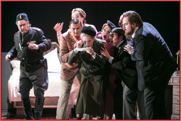 Die Geschehnisse des „Trittico“ liegen gemäß Libretto um je drei Jahrhunderte auseinander. Corradi verknappt sie auf Jahrzehnte, warum auch immer. Bei “Schicchi“ wirkt das freilich insofern logisch, als Simone des Titel eines Podestà inne hat, ein Amt, welches nur die Epoche von Dante (aus dieser stammt der Opernstoff) kannte sowie die Zeit des italienischen Faschismus kennt. Also hängt über dem Bett des gestisch aufwändig abkratzenden Buoso Donati ein Porträtbild Mussolinis. Und wenn in neuerer Zeit das Abhacken einer Hand und die Verbannung für Testamentfälschung noch gelten könnte, dann wohl am ehesten unter diesem brutalen Regime.