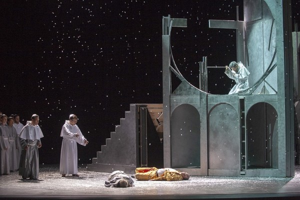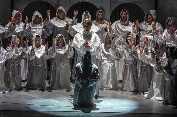 Mit Farben kann man trefflich spielen. Die machen die Bühne bunt, werden mit verschiedenen Attributen assoziiert und bieten so natürlich wunderbar Raum, mit Symbolismen und Bedeutungen zu spielen. Weiß zum Beispiel ist ein Sinnbild für Reinheit, gepaart mit einem transluzent erscheinenden Silbergrau kommt noch etwas Edles, Unnahbares hinzu. Man könnte also beispielsweise eine Glaubensbruderschaft in diese Farbe hüllen. Rot stet für Zorn und Liebe und Blut und Macht und stünde damit dem Adel gut zu Gesicht. Wenn jetzt eine Adelige nicht ganz so will wie der Rest des Adels, bietet sich die Komplementärfarbe Grün an. Und schwarz wie der Teufel kommt natürlich die Sünde in Form des Verführers daher. Wer aber ein die Augen schmerzendes Gelb fürs kampfeslüsterne Volk ausgesucht hat und warum? Das kann ich Ihnen nicht beantworten. Fragen könnten wir Jarg Pataki, der für diese Farbkonzept verantwortlich zeichnet – und den Rest der Szene auch. Und vielleicht könnte er uns ein wenig darüber erzählen, der Rest seiner Inszenierung ist nämlich schlicht nichtssagend. Da wird herumgestanden wie auf Votivtafeln. Von Interaktion, geschweige denn Auseinandersetzung mit den vielschichtigen Beziehungen der Protagonisten zueinander, keine Spur.
