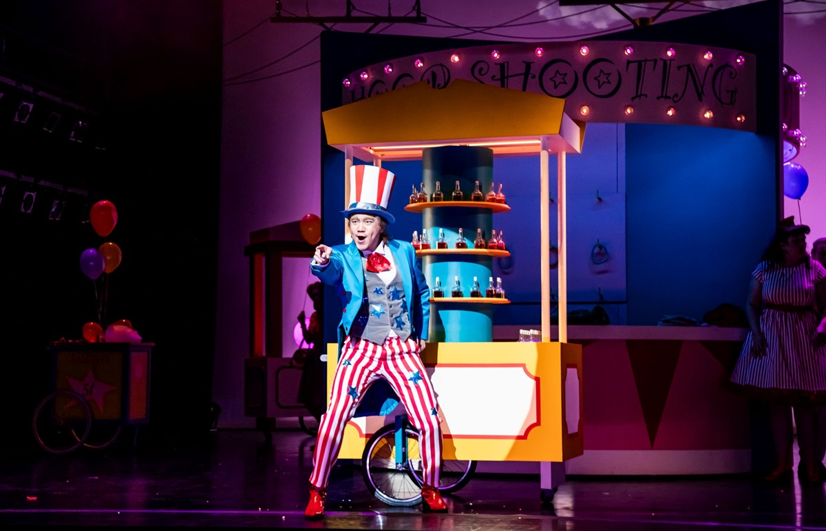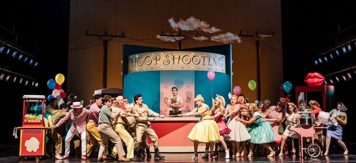 Die USA gilt als das Land der unbegrenzten Möglichkeiten, in dem sich alle Träume erfüllen lassen. Wohl deshalb siedelt Regisseur Joan Anton Rechi seine Version von L’elisir d’amore dort an: schließlich geht es in Donizettis Dauerbrenner um Träume und Sehnsüchte, die sich auf wundersame Weise erfüllen sollen. Wenn sich der Vorhang hebt, befinden wir uns auf einem US-amerikanischen Rummelplatz der 50er Jahre mit Wurfbuden, Zuckerwatte und Popcorn. Dank der bonbonfarbenen Kostüme von Sandra Münchow gelingt die Zeitreise perfekt und so ist der Boden bereitet für einen entzückenden Opernabend. Rechispielt mit den Klischees und punktet mit lebendiger Personenführung: immer wieder finden am Rand der Handlung urkomische Zeitlupenszenen statt, man hat ständig etwas zu entdecken und dass Dulcamara, der allen alles verspricht, wie eine Mischung aus Uncle Sam und Donald Trump daherkommt, ist gewiss auch kein Zufall. Nach der Pause verlegt Rechi die Handlung in ein typisch amerikanisches Diner, das Gabriel Insignares farbenfroh gestaltet hat, lässt den vielbeschäftigte Chor (hervorragend vorbereitet von Alexander Einarsson) in herrlichen Uniformen auftreten. Es wird also optisch viel geboten gestern Abend.