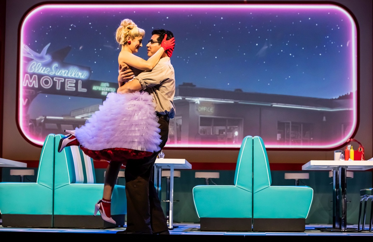 ein knallbunter Liebestrank wird seit gestern am Theater Aachen ausgeschenkt. Der andorranische Regisseur Joan Anton Rechi entführt uns mit seiner quirligen Produktion in die USA der 1950er Jahre und auch das komplett aus jungen Nachwuchssängern bestehende Solistenensemble begeistert dabei mit ansteckender Spielfreude.