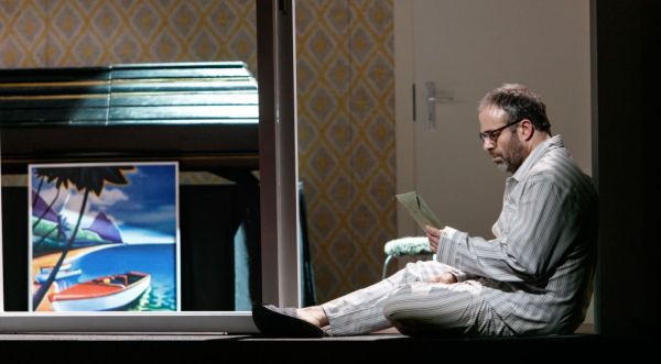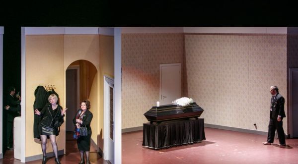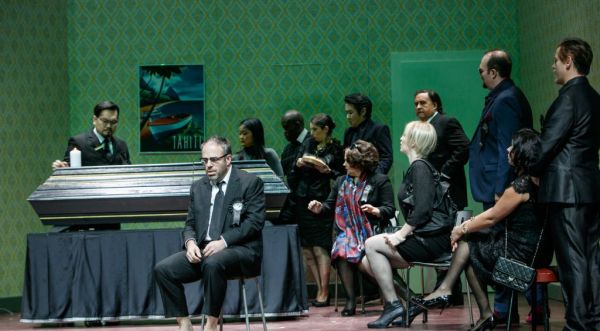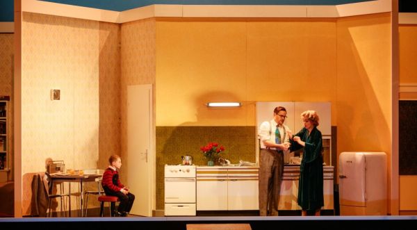 Zusammen mit ihrem Ausstatter-Team (Bühne: Mathis Neidhardt, Kostüme: Annemarie Bulla) hat sie ein Inszenierungskonzept ersonnen, welches Vergangenes und Gegenwärtiges miteinander verzahnt, Gefühle von einst und jetzt auf fast zärtliche Weise in Beziehung setzt. Da gibt es beispielsweise das unmittelbare Nebeneinander des alten und des jungen Sam, Junior wird als ganz kleiner Junge bereits stumm in die Handlung von „Trouble in Tahiti“ einbezogen, und die tote Dinah erscheint zur musikalischen Introduktion des 3. Aktes von „A Quiet Place“ nochmals auf der Bühne, um ihren geliebten Garten in Augenschein zu nehmen, um den sich jetzt Dede auf etwas ruppige Weise kümmert. Mit solchen Querverbindungen, die mitunter ganz schön ans Herz greifen, bietet Nina Russi eine ganz, ganz große Regiearbeit. Dabei spielt das Bühnenbild eine besondere Rolle. Die ganz auf Sams Haus konzentrierte Handlung spielt sich auf einer Drehbühne ab. Große und kleine Räume mit immer neu gestalteten Interieurs gleiten ständig am Auge des Zuschauers vorbei. Mitunter meint man, bei all diesen Bildwechseln einem Film beizuwohnen. Hinzu kommt eine lebendige und psychologisch brisante Personenführung. Köstliches Detail bei den Beerdigungsfestivitäten: eine junge Dame läßt sich unverfroren neben der toten Dinah fotografieren. Das Aachener Publikum war erkennbar von all diesen optischen Reizen angetan. Berechtigterweise stürmischer Beifall.