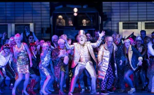Nach der Pause wird der Abend auf einmal grell farbig – das Geld, das Claire Zachanassian in das Städtchen Güllen gepumpt hat, um die Menschen abhängig und hilflos zu machen, zeigt sich überall. Die Reklame ist bunt und vielfältig, Ills Laden ist zum riesigen Supermarkt geworden, ein mondänes Ambiente mit Videoübertragung gibt den Spielort für den letzten Akt in Ills Leben, wo die einst so stillen, grauen Güllener nun in Glitzergewändern eine hektische Party feiern. Dazu kommt ein Zug, der wie in einem Magritte-Gemäde durch die Wand hereinkracht, und der Mann, der dem Geldsegen möglicherweise im Wege stehen könnte, wird im Hintergrund gekillt. Man liefert ihn der Dame, und das ist dann grausig, nicht als Leichnam, sondern als Stücke in schwarzen Plastikmüllsäcken (immerhin ist der Regisseur geschmackvoll genug, nicht den Kopf hervorholen zu lassen…)