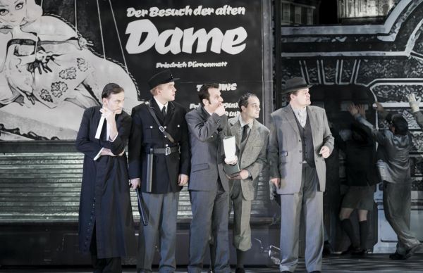 Sicherlich, Friedrich Dürrenmatt selbst hat für Einem sein berühmtes Theaterstück zum Libretto umgearbeitet, er musste also davon überzeugt gewesen sein, dass die Musik dem Werk noch eine Dimension hinzufügt. An sich ist die „Alte Dame“ als Parabel über die Käuflichkeit des Menschen allerdings ohnedies perfekt. Wie schnell krachen die Vokabel von „Humanität“ in sich zusammen, wenn das Geld winkt, wenn der hemmungslose Kapitalismus die blanke Gier nach mehr und mehr erweckt… da nimmt man jeden Vorwand, um der Milliardärin Claire Zachanassian in ihrem einstigen Heimatort Güllen ihren Herzenswunsch zu erfüllen: Den Tod des Mannes, der sie einst, als sie noch die arme, hilflose Kläri Wäscher war, mit ihrem Kind sitzen ließ… Sie will schließlich sehr großzügig dafür bezahlen.