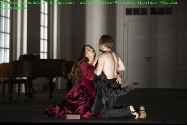 Die US-amerikanische Sopranistin Jacquelyn Wagner bot gesanglich eine Euryanthe zum Niederknien. Das Bild der schuldlosen edlen Frau verkörperte sie geradezu idealtypisch. Und dieses „Tugendgesülze“ hat uns später auch Richard Wagner in seiner Hochzeitsnacht bei Lohengrin und Elsa nicht erspart, wo es nicht ans „Eingemachte“, geht, sondern die „süßen Düfte“ beschworen werden… In Theresa Kronthaler als Eglantine hat sie eine berechnende Rivalin um die Gunst Adolars, die vor nichts zurück schreckt. Deren Ausdrucksskala reichte von zarten, einschmeichelnden Tönen bis zu hysterischem wahnhaftem Toben am Ende der Oper. Für all dies stand der begnadeten Sängerin an diesem Abend auch ein schillernder kräftiger Mezzosopran zur Verfügung. Dem britischen Bariton Andrew Foster-Williams mutete der Regisseur zu, sich an die schlafende Euryanthe völlig nackt in Verführungsabsicht heran zu schleichen. Er tat es aus nicht nachvollziehbaren Gründen. Hoffentlich hat sich das auch in einem Zuschlag auf seine Gage bemerkbar gemacht?