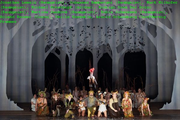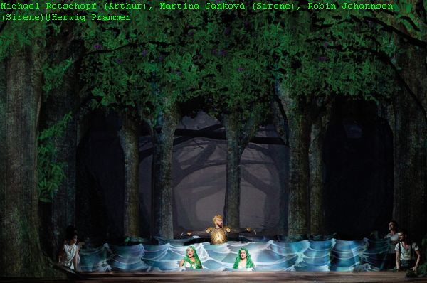 Den Sprechtheaterteil haben die Schauspieler und Schauspielerinnen der Berliner Aufführung mit zwei Ausnahmen übernommen. Die Rolle des Merlin, die in Berlin noch von dem mittlerweile verstorbenen Hans-Michael Rehberg verkörpert wurde, hat in Wien Jörg Gudzuhn großväterlich freundlich interpretiert. Conon, in Berlin noch Axel Wandtke, wurde in Wien von Roland Renner dargestellt. Michael Rotschopf gab einen heldenhaften King Arthur, als blinde Emmeline, die in einer berührenden Szene wieder das Augenlicht erlangt, konnte Meike Droste punkten; Oliver Stokowksi gefiel in der Rolle des Intriganten Osmond an der Seite der feindlichen Sachsen; Max Urlacher gab den eher schwächelnden sächsischen Anführer Oswald und in der Rahmenhandlung den schüchternen Liebhaber Dr. Oswald; Tom Radisch ergänzte als böser Erdgeist Grimbald, Sigrid Maria Schnückel als köstliche Amme Mathilda und Steffen Scheumann als Pfarrer Aurelius. In der von mir besuchten Vorstellung war Quentin Retzl als pubertierender junger Arthur zu sehen. Martina Janková konnte als Luftgeist Philidel, gleich dem Luftgeist „Ariel“ in Thomas Adès Oper „The Tempest“, anmutig über die Szenerie schweben und viele herrliche Spitzentöne verbreiten. Robin Johannsen verströmte ihren prächtigen Sopran auch in mehreren Rollen. Die beiden Tenöre Johannes Bamberger und Mark Milhofer setzten ihre eher schlanken Stimmen gekonnt zu Gehör; die beiden Bässe Dumitru Mădărăşan und Jonathan Lemalu ergänzten rollengerecht, wobei Letzterer im dritten Akt noch den von Klaus Nomi einst zum Kult Song geadelten „Cold-Song“ mit wahrhaft kälteschlotternder Stimme interpretieren durfte.