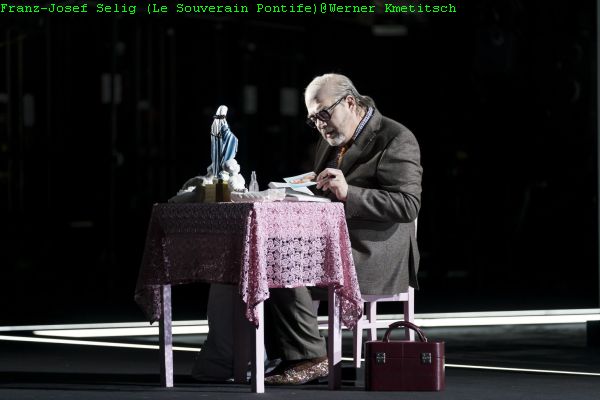 Der Opernbesucher aber wird sogleich wieder mit Brachialgewalt durch das Einblenden des berühmten S.P.Q.R., der Abkürzung für das lateinische Senatus Populusque Romanus (Senat und Volk von Rom) daran erinnert, dass die Handlung eigentlich im antiken Rom angesiedelt ist. Spätestens dann, wenn Franz-Josef Selig seinen schäbigen Anzug ablegt, um sich in den Souverain Pontife, den Pontifex Maximus, zu verwandeln, kleidet ihn Kostümbildner Jorge Jara in die Robe eines katholischen Würdenträgers (?), halb Bischof (violett) und halb Kardinal (rot), ein. Ob das aus Unkenntnis geschah, bleibt uns das Programmheft leider schuldig. Am Ende der Oper ersticht ihn jedenfalls Claudia Mahnke in der Rolle der Grande Vestale, aber keine Sorge. Als ein Blitz das ausgegangene Feuer im Vestatempel aufs Neue entfacht, geschieht noch ein zweites Wunder: Der Hohepriester darf sich wieder aus seiner Leichenstarre erheben. Apropos Feuer: Es handelt sich natürlich nicht um ein einfaches Feuer, sondern um ein übergroßes rotes Plastikherz, das die junge Vestalin Julia an sich nimmt und welches knapp vor dem Ende der etwa dreistündigen Oper wieder an seinen angestammten Platz zurückkehrt. Regisseur Erath konnte auch der Versuchung nicht widerstehen, sich gewaltsam zwischen verschiedenen Zeitebenen hin- und her zu bewegen.