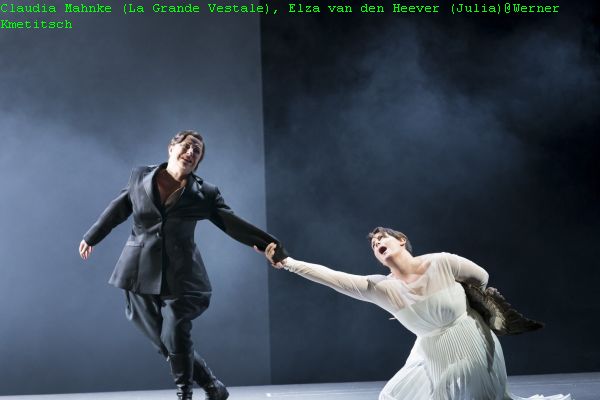 Und da fügen sich dann Symbole des alten Roms, wie Helm, Brustpanzer und ein ausgestopfter Raubvogel nahtlos an den als Hippies gekleideten Chor des Schlussbildes oder die Madonnenstatue an. Die Drehbühne von Katrin Connan mit einem riesengroßen weißen Kubus in der Mitte, ergab, im zweiten Akt geöffnet, das Bild des Inneren des Vestatempels mit einer Strahlenkranzmadonna in der Mitte eines seichten Wasserbeckens stehend. In geöffnetem Zustand erweist sich diese Statue dann als Hinrichtungsmaschinerie ähnlich der sogenannten „Eisernen Jungfrau“. Elza van der Heever als Julia musste am Ende der Oper eine eigenartige Schminkszene – wohl als Vorbereitung auf den Tod (?) – über sich ergehen lassen, die ihr Gesicht zu einer clownesken Maske verzerrte. Das „Lächerlichmachen“ im Angesicht des Todes könnte vom Regisseur vielleicht dem mittelalterlichen „Teeren und Federn“ nachempfunden sein? Sie gestaltete die Rolle der Julia sehr eindringlich, in gesanglicher Hinsicht aber hörte sich ihr Sopran in der Höhe vielerorts ziemlich schrill an. Michael Spyres als ihr heimlicher Geliebter Licinius wartete mit einem vor allem in der Mittellage gut geführten Tenor auf, ebenso Sébastien Guèze als Cinna meist in Unterwäsche bekleidet mit etwas hellerem Tenor und ausgezeichneter Körperbeherrschung in den „Turnübungen“.
