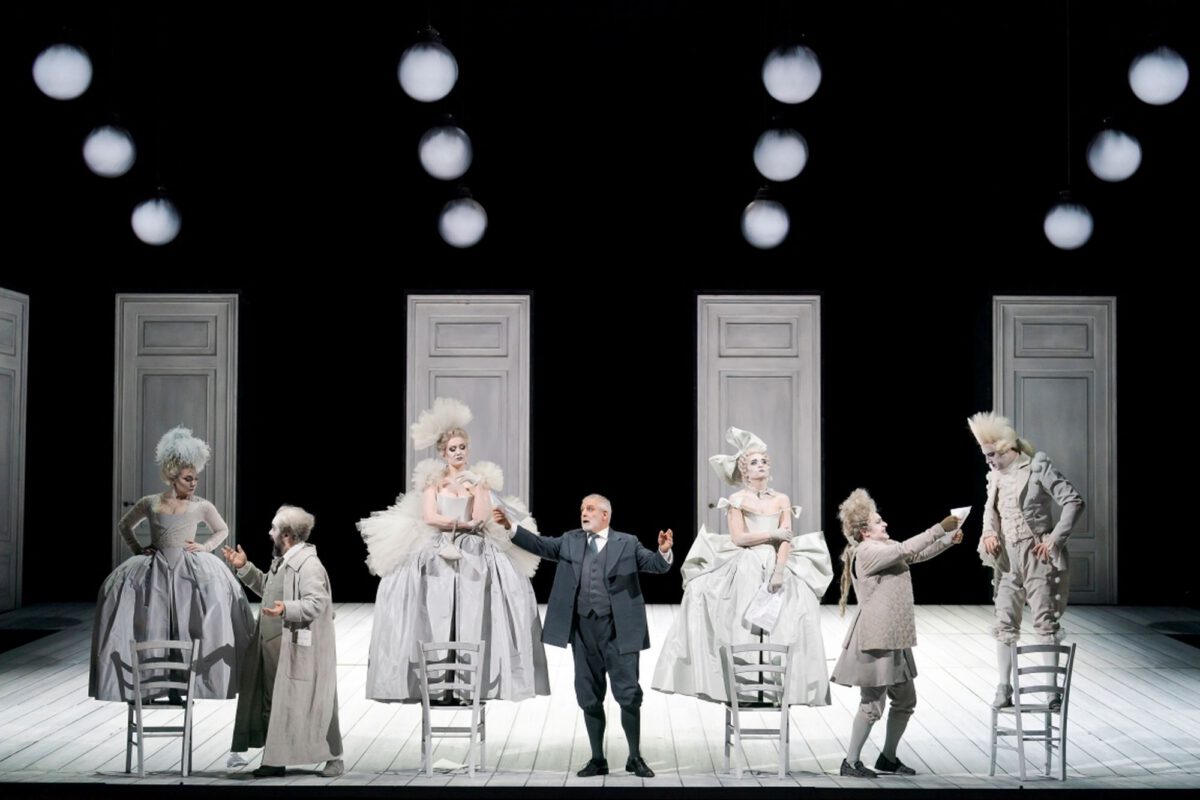 Bariton Alessio Arduini war in der Rolle des Passagallo bemüht, seine Tanzcompanie ins rechte (Rampen-)Licht zu rücken. Im dritten Akt wich Regisseur Laurent Pelly von der Vorlage ab: Statt einer Unterbrechung durch Zuschauer gab es technische Probleme, das Bühnenbild fiel zusammen und die Solisten sangen weiter. Das Ballett in der Choreografie von Lionel Hoche tanzte unbeirrt einen pas de six im Stil „weiße Schwäne“ und Pellys ironische Kostüme des 18. Jahrhunderts verstärkten die unterhaltsame Atmosphäre. Die in alter Buffotradition mit Männern besetzten Mütterrollen wurden von Tenor Alberto Allegrezza (Braghero-na) und den Countertenören Nicholas Tamagna (Befana) und Filippo Mineccia (Caverna) umwerfend komisch karikiert. An der Spitze seines Ensembles Les Talens Lyriques stand Christophe Rousset, der Gassmanns Position als Glied der Entwicklung zwischen Gluck und Mozart feinfühlig herausarbeitete und deutlich unterstrich. In den Rezitativen wurde er am Cembalo von Korneel Bernolet und am Cello von Emmanuel Jacques vorzüglich unterstützt. Laurent Pelly ist es als Regisseur im schlichten Bühnenbild von Massimo Troncanetti gelungen, die Handlung als Alptraum des Impresarios zu inszenieren, womit er der im Grunde fehlenden dramatischen Struktur einen abwechslungsreichen Rhythmus verleihen konnte. Das Bühnenbild stellt anfangs nur schlichte Räume mit ein paar Sessel und einem Klavier, das herein- und wieder hinausgetragen wird, dar. Im dritten Akt werden dann die Kulissen typischer Barockausstattungen, selbstredend mit dem obligaten Elefanten für das indische Milieu, zitiert. Hier brilliert auch der Chor der Tänzer Carl Kachouh, David Neumann, Marie Charpentier Leroy und Erica Alberini als Rapina sowie die sechs Tänzer Samuel Adam, Samir Bellido, Blaž Cunk, Jordan Deadman, Michael Gross und Filippos Psychogios. Für die einfühlsame und zugleich spannende Lichtregie sorgte Marco Giusti. Obwohl viele Rezitative gestrichen wurden, dauerte die Aufführung über drei Stunden und erhielt dennoch begeisterten Applaus vom Publikum, das die brillante Regie zu schätzen wusste und so dem Abend zu einem triumphalen Erfolg verhalf.