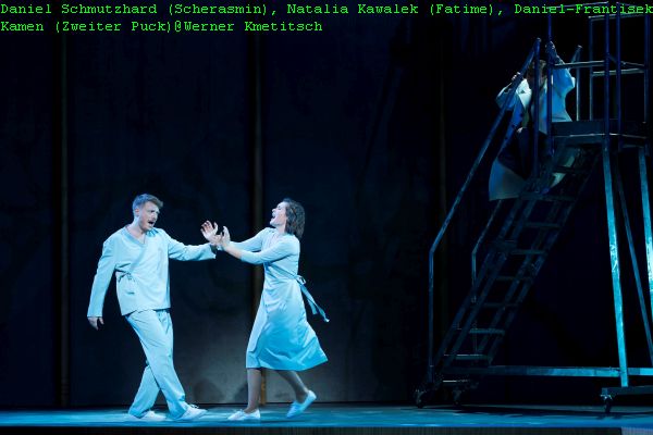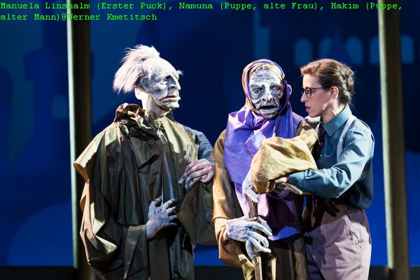 in Tunis werden durch Habjans Markenzeichen, den interaktiv eingesetzten Hand- und Stabpuppen aufgelockert. Das Bühnenbild von Jakob Brossmann zeigt ein Labor mit Schaltpulten und einer Schaltrampe, die an das Labor von Dr. No aus dem ersten Bond Film „007 jagt Dr. No“ aus dem Jahr 1962 erinnert. Aber das ist nicht das einzige Filmzitat. Wenn Hüon und Rezia dem Feenkönig Oberon den Kopf seiner Puppe entreißen und ihn sowie Titania damit in den Bann schlagen können, erinnert man sich unweigerlich an den Film „Indiana Jones und das Königreich des Kristallschädels“ aus dem Jahr 2008. Aus den Schaltschränken im Labor werden auch riesige Kartonwellen zur Veranschaulichung des großen Sturmes, der zum Schiffbruch führt, eingeschoben. Und die letzte Prüfung, der Hüon unterzogen wird, nämlich die Verführungsversuche durch die Elfen, nimmt Wagners Blumenmädchenszene mit Parsifal vorweg. Denise Heschl staffierte alle Beteiligten mit den adäquaten Kostümen aus, wobei die hellblauen Jacken von Hüon und Scherasmin mongolischen Gewändern nachempfunden wurden. Michael Bauer tauchte die einzelnen Szenen in spannende Lichteffekte ein und sorgte auch für manch lauten pyromanischen Effekt. Mauro Peter als Oberon hörte sich für mein Empfinden stellenweise etwas angestrengt an, Juliette Mars als seine Gattin Titania darf in dieser Fassung auch singen, und einmal sogar an Stelle Oberons hinter der riesengroßen Puppe. Vincent Wolfsteiner in der Rolle des Hüon von Bourdeaux verfügt über einen an sich kräftigen Heldentenor, der aber von Zeit zu Zeit ins Brüllen umkippte. An seiner Seite hatte Annette Dasch, die die Rolle der Rezia schon in München gesungen hatte, für mich stimmlich den stärksten Eindruck hinterlassen. Ihre von Koloraturen gespickte Arie im zweiten Teil wurde vom Publikum zu Recht mit Bravo-Rufen, in den sich ein vereinzelter ungerechtfertigter Buh-Ruf mischte, geadelt. Die in Polen geborene Natalia Kawałek-Plewniak als Fatime brachte ihren lyrischen Mezzosopran im Duett mit Annette Dasch wohltönend zur Geltung. Als ihr Partner konnte Daniel Schmutzhard in der Rolle des Scherasmin seinen robusten Bariton