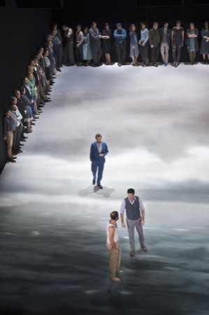 Bei dem brutalen Peter Grimes fühlt er sich einigermaßen geborgen. Er sieht in ihm eine Art von „Vaterfigur“, zu der er sich mit all seinen Sinnen hingezogen fühlt. Die mancherorts geäußerte Forderung nach sogenannten „werkgetreuen“ Inszenierung kann wohl nur einem frommen Wunschdenken entspringen, würde doch dadurch jegliche künstlerische Interpretation ad absurdum geführt und jede Neuinszenierung eines bekannten Werkes obsolet machen. Es sei an dieser Stelle nur an Richard Wagners Forderung: „Kinder, schafft Neues!“ (1852) erinnert. Darüber hinaus bezog Britten in seiner Oper zum Thema der latent mitschwingenden Homosexualität zeitlebens nicht Stellung, galt diese doch zum Zeitpunkt der Uraufführung der Oper noch als strafbarer Tatbestand nicht nur in England. Von der minimalistischen Ausstattung von Johannes Leiacker besticht noch immer das über den Rand der schräg geneigten Bühne symbolträchtig hinausragende Bett, als Ort der Flucht, der Gewalt, der Sehnsucht und angedeuteten sexuellen Begierde, bedrohlich, denn der tiefe Orchestergraben versinnbildlicht zugleich die Gefahr des Absturzes. Zusammen mit den zeitlich nicht näher verorteten Kostümen von Judith Weihrauch denkt man unwillkürlich an die Filme des dänischen Kultregisseurs Lars van Trier. Peter Grimes ist ein Zerrissener, auf der Suche nach dem, was er sich als sein „bürgerliches Lebensglück“ erträumt: Ein wenig Wohlstand, um dann endlich zu heiraten und eine Familie zu gründen. Der aufopferungsbereiten Lehrerin Ellen Orford gelingt es aber nicht, dem sich in seiner Einsamkeit Verzehrenden körperliche Zuneigung und Geborgenheit zu schenken, Grimes aber stößt sie barsch von sich. Er hat bereits einen Gehilfen während eines Fischzugs verloren und nun begegnet ihm das gesamte Dorf mit großem Misstrauen bis auf den ehemaligen Kapitän Balstrade, der sich als Außenseiter dem Ausgestoßenen zugetan fühlt. Peter Grimes aber erwidert auch diese Zuneigung für ihn nicht. Stattdessen nimmt er sich trotzig einen neuen Gehilfen und wehrt die zärtlichen Annäherungsversuche des jungen Mannes auf der Suche nach eigener Selbstverwirklichung nicht ab. Ein Happy End kann es in dieser Konstellation nicht geben. Auch dieser Gehilfe ertrinkt und erscheint nochmals in einer Apotheose in einem grandiosen Pas de Deux mit Peter Grimes, der den toten Knaben zärtlich in seine Arme schließt und der in seiner Fantasie wieder zum Leben erwacht (Choreografie: Thomas Wilhelm). Auf Anraten von Kapitän Balstrade versenkt Peter Grimes schließlich sein Boot in der rauen See. Auch wenn das Meer dabei als stimmungsgebendes Element optisch nicht zu sehen ist, so ist es omnipräsent in den Seelen der Beteiligten vorhanden, denn diese gleicht dem Wasser.