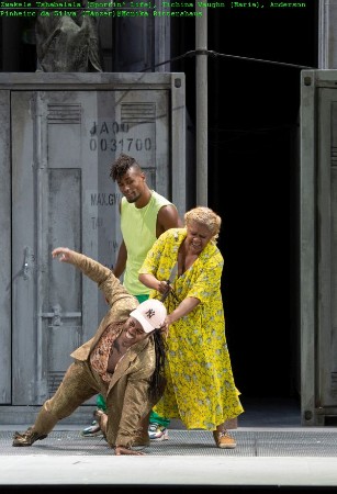 Vielmehr sollte man die Bezeichnung „Afroamerikaner“ oder in Deutschland etwa „Afrodeutsche“ verwenden. Dieses Verständnis war zur Zeit der Komposition von „Porgy and Bess“ freilich noch nicht im Bewusstsein der Mehrheit der Bevölkerung verankert. Matthew Wild, der künstlerischer Leiter der Cape Town Oper, verlegte die Handlung vom romantischen Fischerdorf in eine kalte Container-Stadt, wo sich nach der Pause Haufen alter Kleider türmen. Jeder einzelne dieser übereinander-gestapelten Container bildet eine Wohneinheit. Üblicherweise kommen solche Container bei großen Frachtschiffen zum Einsatz. Sonst erinnert nur ein einzelnes Fischerboot mit Heckmotor an die Verortung der Handlung nahe dem Meer. Flackernde Neonröhren deuten stürmische Gewitter an. Die stimmige bunte Ausstattung von Katrin Lea Tag passt sich dem Regiekonzept von Matthew Wild sensibel an. Aus der Vielzahl an Personen und Nebenhandlungen kristallisieren sich im Laufe des Abends, neben den Titelhelden der Oper, noch Clara, Serena und Maria, sowie die Männer Crown, Sportin’Life und Jake mit stärkerem Eigenleben heraus. Als Milieustudien fügten sich die von Louisa Talbot choreographierten Tanzszenen organisch in die Handlung ein.