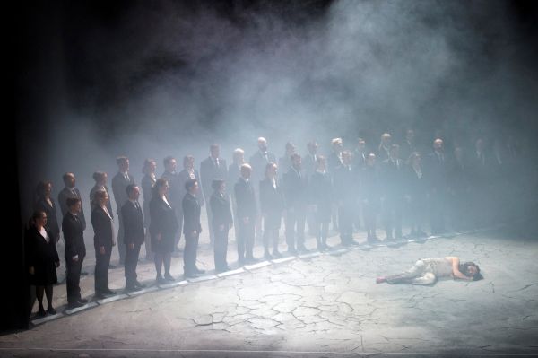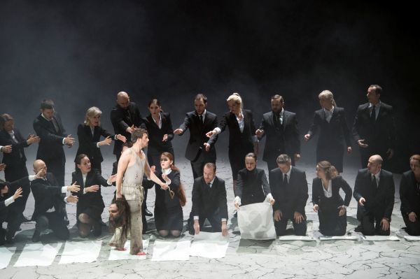 Im übrigen erlebt man einen Saul, der machtvoll in Schwarz als Florian Boesch da steht, oft mit einem Speer, der ihn Wotan-gleich erscheinen lässt. Obwohl die Hauptfigur, ist er musikalisch nicht überreich bedacht, kann aber in einigen Rezitativen stark ausdrücken, wie er unter Druck zu immer böseren Gedanken und Absichten fortschreitet. Er geistert übrigens auch nach seinem Tod (da geht das Werk noch gut eine halbe Stunde weiter und will und will nicht enden) über die Bühne…