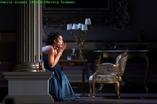 Bei dem Regieduo Moshe Leiser und Patrice Caurier entrollt sich die verquere Handlung in etwa der Mitte des 20. Jhd. in imperialen Josephinischen Gemächern von Christian Fenouillat. Die Kostüme von Agostino Cavalca sind aus der heutigen Zeit. Zunächst dient dieser Palast noch als Lazarett, denn im ersten Akt ist noch Krieg. Mit einem Hang zu Ironie hat das Regieteam auch Medeas Zauber inszeniert. Da bewegen sich Kulissen wie von Geisterhand gezogen, Diener erscheinen als Werwölfe, zwei überdimensionale Hände werden vom Bühnenrand links und rechts bedrohlich in die Szene geschoben und schließlich entzündet Medea auf der bereits gedeckten Herrschaftstafel besonders effektvoll eine Handgranate. Aber die Dea ex machina in Gestalt von Minerva ist für das Happy End noch rechtzeitig zur Stelle…