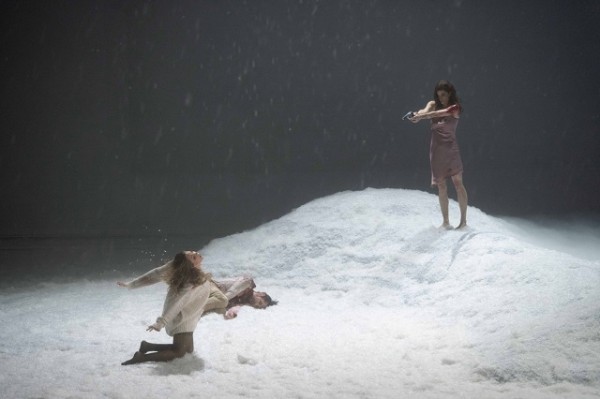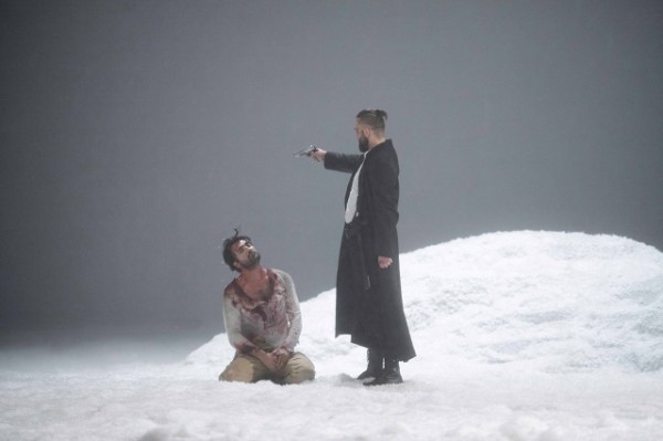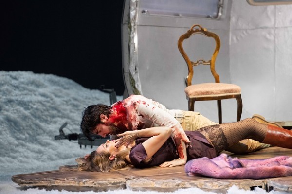 Das Setting von Kušejs Tosca ist eine eiskalte Winterlandschaft (Bühne: Annette Murschetz) im Schneesturm, Symbol für die Kälte und Brutalität der von Polizeichef Scarpia errichteten Schreckensherrschaft. Im Zentrum steht ein abgestorbener Baum an dessen Stamm ein Torso gebunden ist und daneben ein Marienbild. Von den Ästen baumeln abgehackte blutende Gliedmaßen. Im Hintergrund steht ein alter Wohnwagen, der Bayreuths aktueller „Tannhäuser“-Produktion entlehnt sein könnte, und in welchem der Tyrann Scarpia haust. In der Ferne hört man einen Hund bellen, der schließlich einen auf die Bühne geworfenen Unterarm aufhebt und der werfenden, für das Publikum unsichtbaren, Person zurückbringt. Die Verstärkung der omnipräsenten Gewalt und des Grauens in Puccinis Oper gelang Kušej recht gut, nicht jedoch der Gegensatz zwischen Kunst und Kirche, der im Inneren von Sant’Andrea della Valle in konventionellen Inszenierungen vorgeführt wird. Gelungen ist Kušej auch die Einführung der stummen Rolle der Gräfin Attavanti (Sophie Aujesky), die der Maler Cavaradossi heimlich in einem Porträt verewigte, das er vor der eifersüchtigen Tosca zu verbergen sucht. Das Innere des Palazzo Farnese ist in dieser Inszenierung dem Innenraum des Wohnwagens, in dem Scarpia genüsslich Wein trinkt und dem Gesang von Tosca aus dem Radioapparat folgt, gewichen. Elegant in einen Pelzmantel gehüllt, versucht Tosca sich Scarpia hinzugeben, nur um das Leben ihres geliebten Cavaradossi zu retten. Mit mehreren Messerstichen richtet sie ihn und wirft voller Abscheu ein an der Wand hängendes Holzkreuz auf den Boden.