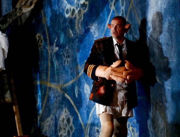 Das zeigt sich insbesondere bei den mit missgebildeten, übergroßen Händen und Ohren ausgestatteten Höflingen, die zu Beginn ihre modernen Anzüge mit reichlich bizarr anmutenden Kostümen vertauschen. Da drängt sich einem nachhaltig der Eindruck auf, dass es sich bei dieser bunten, komischen Schar um die sieben Zwerge aus dem Märchen „Schneewittchen“ handelt. Dass diese Impression nicht trügt, bestätigt sich spätestens im zweiten Akt, wenn Nyssia sich in ihrem unterirdischen Gemach, das eher wie ein Keller wirkt, zusätzlich zu ihrer roten Haarschleife auch noch das blaue Kleid Schneewittchens aus dem gleichnamigen Film von Walt Disney anzieht, wobei man sie für einen kurze Augenblick oben ohne, wenn auch mit dem Rücken zum Publikum, sieht. Gleich einer Lulu wird die Königin zum puren Objekt degradiert. Sie gewinnt aber zunehmend an Eigenständigkeit und entwickelt einen eigenen Willen, der schließlich in dem Mordauftrag an ihrem Mann mündet.