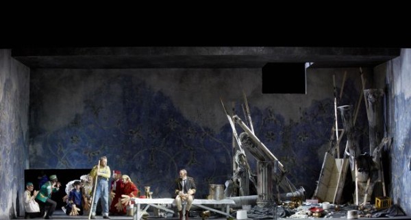 Die Regie sollte ursprünglich Lorenzo Fioroni übernehmen. Eine Erkrankung zwang ihn aber bereits in einem sehr frühen Stadium der Arbeit, die Produktion abzugeben. Diese wurde dann von Soren Schuhmacher übernommen und auf der Grundlage konzeptioneller Ideen Fioronis zu Ende gebracht. Mit im Boot saßen Paul Zoller (Bühnenbild) und Annette Braun (Kostüme). Das Ergebnis ist sehr überzeugender Natur. Das halb in Trümmern liegende Bühnenbild weist Aspekte verschiedener Glaubensrichtungen auf. Da finden sich unter einer Anhäufung von Müll sowohl christliche, aber auch antike und islamische Elemente, die wohl aus Beutezügen des hier offenbar auch kriegerischen Königs Kandaules stammen. In erster Linie wird er von der Regie aber als Künstler gezeigt, der aufgrund des materiellen Überflusses, in dem er lebt, seine Schaffenskraft verloren hat. Seine Produktivität ist bei Null angelangt und seine Inspiration erschöpft. So sinnlos wie die ganze ihn umgebende Hofpracht ist auch sein Leben geworden. Das Haus Kandaules ist gleichsam in Dekadenz erstarrt und zudem in hohem Maße entartet.