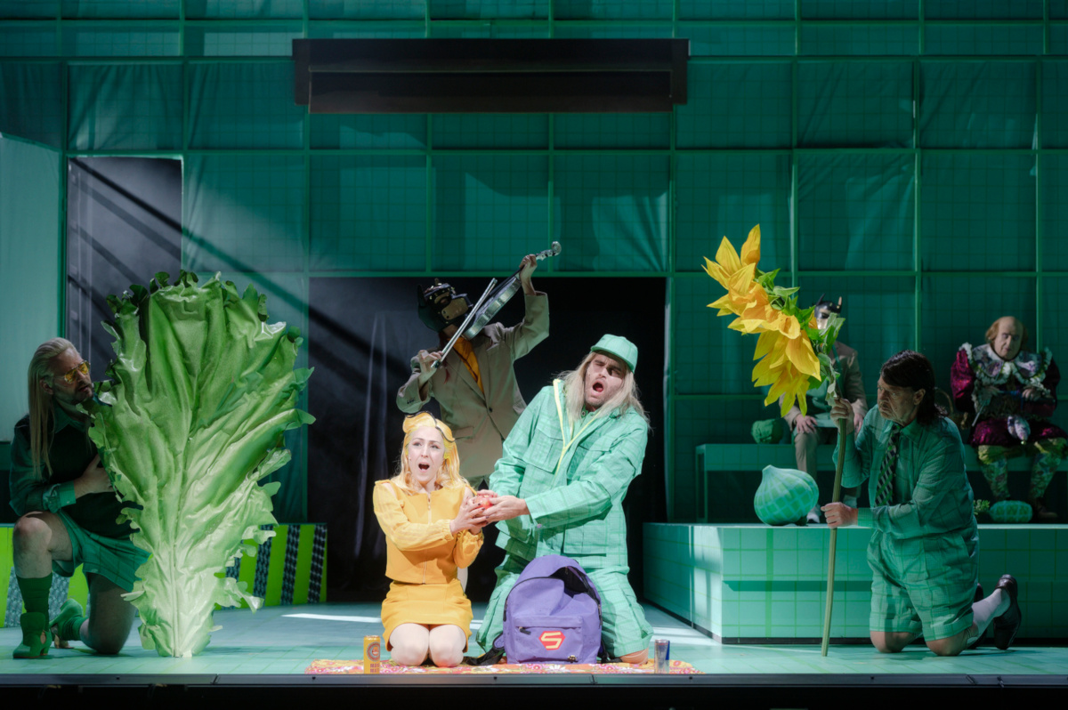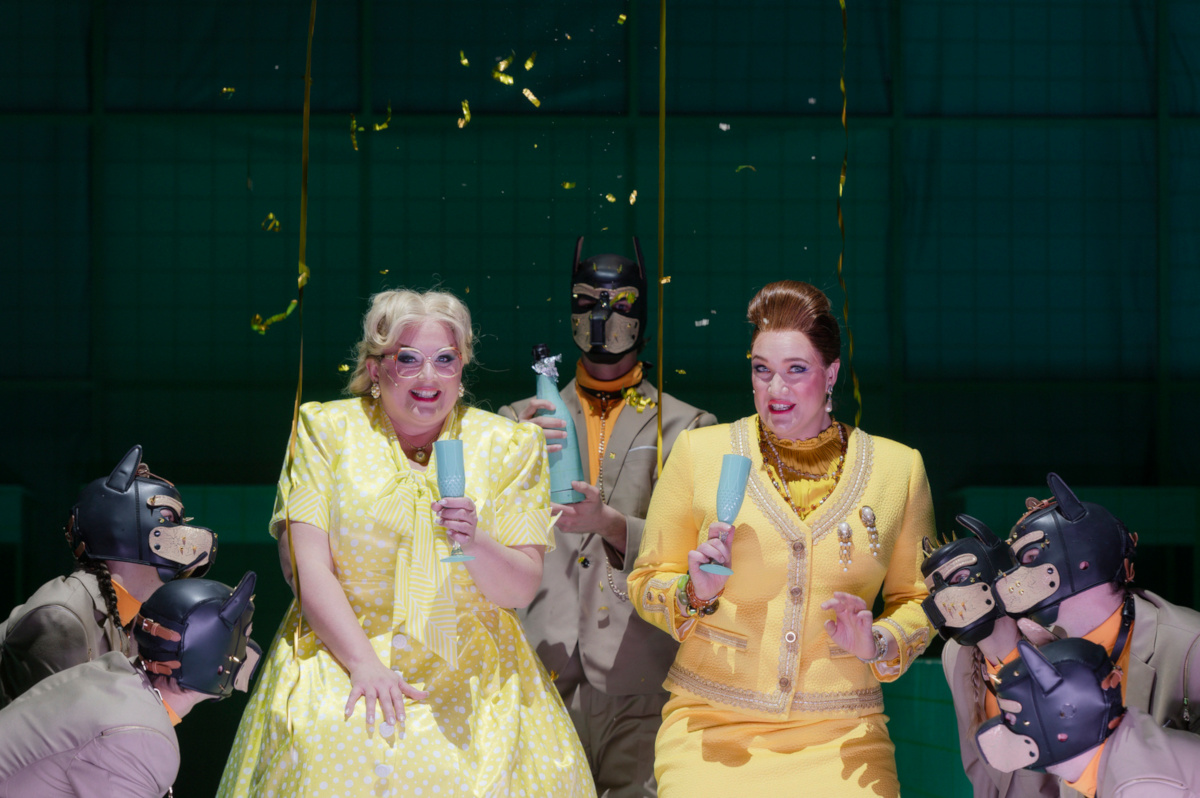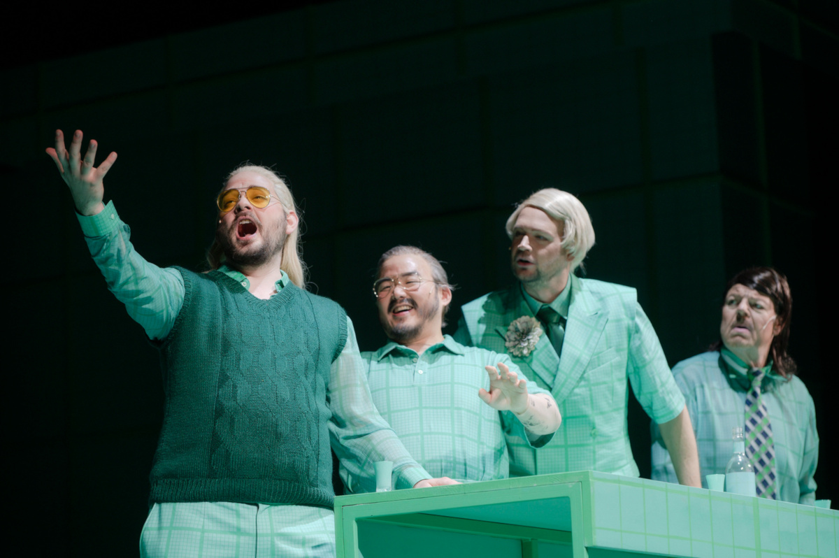 Um dies zu verstehen, muss man nicht einmal die noch in der DDR gedruckte Analyse Vera Oelschlegels studieren, die im schmalen, aber guten und von Sophie Walz erstellten Programmheftel zitiert wird: Windsor sei eine Welt im Wasserglas, in der man immerzu nach irgendwas jage: Geld, Glück, Frauen. Als Peter Konwitschny den Falstaff inszenierte, bemerkte er, dass mit dem Ritter aus altem Adel, dem Sir John, eine hedonistische, also vitale Welt untergehe, während der Protestantismus über die Affekte triumphiere: so auch in Augsburg, beim anderen Falstaff. Denn der dicke Ritter ist nicht nur zunächst der einzige, der buchstäblich Farbe in die Szene bringt, während, bis zum vorletzten Bild, unter der Regie von Christian Poewe sämtliche Weiber giftgelb und die Männer mintgrün gewandet sind. Lena Brexendorff hat sie ausgestattet, während für die Maske, also auch für die Perücken, gleich vier Damen und Herren zuständig sind. Sie alle haben aus den so uniformen wie durchaus sich unterscheidenden Figuren Gestalten gemacht, die so menschlich wie typenhaft anmuten, was ja kein Widerspruch sein muss. Unterm Strich aber sind sie alle eins: komisch.