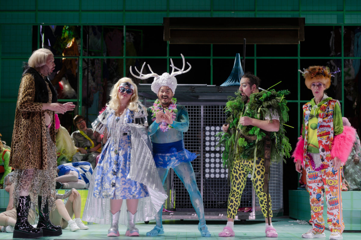 Zur Komik trägt nicht zuletzt der Umstand bei, dass die aus Korea, den Niederlanden, der Ukraine, den USA oder Georgien stammenden Sängerinnen und Sänger die Dialoge nicht in Deutsch, sondern in ihren Muttersprachen sprechen. Seltsamerweise scheint man alles zu verstehen (vorausgesetzt, man hat zuvor das Libretto gelesen…), oder anders: Die Details sind gar nicht so wichtig. Was das holländische „neuken“ heißt, ahnt man (ja, es heißt das, was man ahnt), und die körperliche und lautliche Gestik der Schauspieler sagt schon viel: nicht allein beim lustigen Bayer oder typisch artikulierenden Koreaner. Wer behauptet, dass „Shakespeares“ Sprache mit dieser Technik ignoriert würde, verkennt die Fallhöhe zwischen dem gelegentlich nicht als besonders gut eingeschätzten Originalstück und dem Opernlibretto. Und zweitens funktioniert selbst ein Original-„Shakespeare“, wenn man ihn polyglott aufführt: so geschehen im Jahre 1995 mit dem Düsseldorfer Sommernachtstraum. Zumindest ist es witzig, wenn sich die Ehemänner niederländisch und koreanisch unterhalten und die irische Frau Reich im großen Bühnenstil ihre Sätze zum Besten gibt und das deutsche Wort „Waschkorb“ genussvoll auf der Zunge zergehen lässt. Und schließlich muss man sich dadurch nicht (mehr oder weniger) dabei langweilen, wenn Fremdsprachler versuchen, die deutschen Dialoge des 19. Jahrhunderts zu sprechen. Es genügt schon, so etwas wie Bayerisch zu hören, das auch im erneuerten Text gesungen wird.
