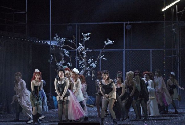 Zu diesen Regiemeistern gehört sicher Lorenzo Fioroni, der bereits zum wiederholten Male in Augsburg am Regiepult Platz genommen hat und dem eine recht außergewöhnliche, spektakuläre, zeitgemäße, wenn auch manchmal etwas überfrachtete Inszenierung von Verdis „Macbeth“ zu bescheinigen ist. Er hat die Handlung trefflich in die Gegenwart transferiert und gekonnt Bezüge zu aktuellen Krisenherden wie der Ukraine und dem Irak hergestellt. Macbeth und Banco sind moderne Soldaten in zeitgenössischen Uniformen und mit Stahlhelmen ausgestattet. Sie campieren in einem von Ralf Käselau entworfenen, von einem Zaun umgebenen riesigen Heereslager, dessen Erscheinungsbild durch einen der jeweiligen Jahreszeit – Frühling bis Winter – entsprechenden Baum dominiert wird. Zunächst in voller Blüte stehend, wird er am Ende, nun gänzlich kahl und dürr, von einer weihnachtlichen Lichterkette umgeben. Die Hexen erscheinen als von Annette Braun eingekleidete Prostituierte, deren Aufgabe wohl die Truppenbetreuung ist.