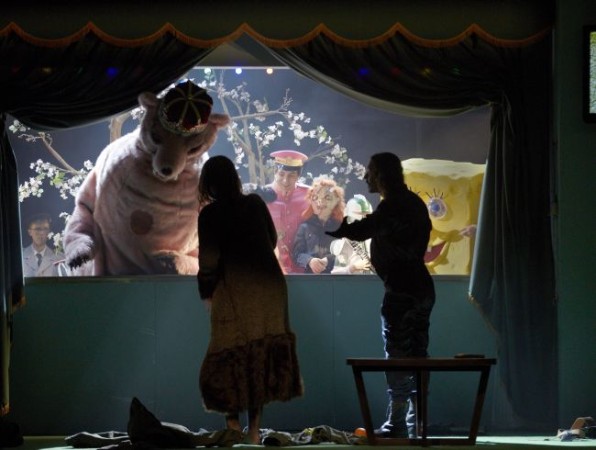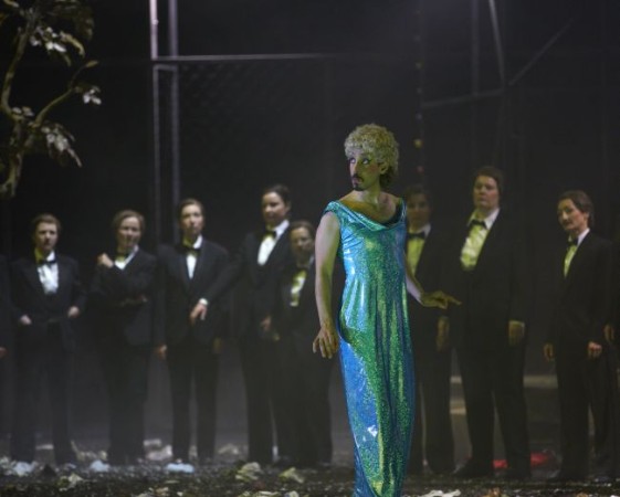 Es ist eine knallbunt zusammengewürfelte Gesellschaft, die Fioroni hier genüsslich aufmarschieren lässt. Das Ganze atmet den Charakter einer groß angelegten bizarren Show mit Adel und Geistlichkeit einerseits und knalligen Figuren aus Comics, Science-Fiction- und Horror-Filmen andererseits, die sich hier ein Stelldichein geben und ihrem als überdimensional-riesiger Teddybär gezeichneten König Duncan huldigen, der später logischerweise auch einen entsprechend großen Sarg benötigt. Derartig skurrile, absurde und überdrehte Bilder rücken das ursprünglich nachtschwarze Geschehen in die Nähe einer Groteske. Fioroni scheut sich nicht, das tragische Geschehen mit mannigfaltigen heiteren und amüsanten Elementen anzureichern und aus dem aufgefahrenen Personal mit Supermann, King-Kong und Darth Vader, dem sich im letzten Akt auch noch der Arzt und die Kammerfrau als Weihnachtsmänner hinzugesellen, eine ziemlich überdreht wirkende Jahrmarktsgesellschaft zu machen. Das verbrecherische Paar an der Spitze des Staats tut wirklich alles, um das Volk mit derartigen Lustbarkeiten von ihren Verbrechen abzulenken – nicht zuletzt deshalb, weil sie politisch eigentlich in den Kinderschuhen stecken geblieben sind und sich von den Staatsgeschäften mehr oder weniger überfordert fühlen. Dieser Ansatzpunkt ist durchaus legitim, birgt im konkreten Fall aber die Gefahr von Überzeichnung in sich, der Fioroni dann auch nicht entgeht. Weniger wäre mehr gewesen.