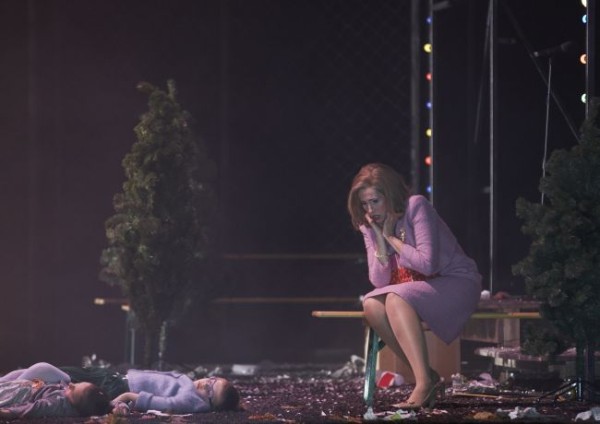 Durch die Krassheit dieser Bilder offenbart sich, dass die Liebe zwischen Macbeth und seiner Lady bereits an ausgemachte Hörigkeit grenzt. Während in den meisten anderen Produktionen des Stücks die Beziehung zwischen den beiden längst erkaltet ist und sie nur noch in einer Zweckgemeinschaft zusammenleben, lieben sie sich hier immer noch, und das mit ganzer Kraft. Diese große Liebe zwischen den beiden ist es auch, die Macbeth und seine Gattin bei Fioroni nicht als durch und durch böse erscheinen lässt. Die hier weniger machtbesessen als in sonstigen Deutungen der Oper vorgeführte Lady, der die Grundfesten eines christlichen Humanismus nicht fremd zu sein scheinen – sie nimmt auch mal eine Hotel-Bibel zur Hand – beteiligt sich zwar am Königsmord, ist hier aber durchaus keine durch und durch verdorbene Machtpolitikerin und hat letztlich genauso viel Skrupel wie ihr Mann, dessen Wahnvorstellungen von Bancos Geist am Ende des ersten Aktes wohl Ausfluss einer übermäßigen Einnahme von Rauschgift sind – noch ein überzeugender aktueller Bezug. Das ausschweifende Sexleben des Paares dient als Gegenstück ihrer Verbrechen. Gleichzeitig geilen sie sich aber auch an der Macht auf – ein ewiger, sich immer wieder neu beflügelnder Kreislauf von Sex and Crime, der die Protagonisten langsam, aber sicher zu seelischen Wracks erstarren lässt. Das gegenseitige Abhängigkeitsverhältnis, in dem sie zueinander stehen, bewirkt, dass die Lady sich Charaktereigenschaften von Macbeth zueignet und er wiederum Züge von ihr annimmt. Zu Beginn des dritten Aktes erscheint er als Transvestit in ihrem Kleid, um gleich darauf von der nun sehr männlich anmutenden, in schicke Anzüge gekleideten Hexenschar vergewaltigt zu werden. Die Psychen des Ehepaares beginnen allmählich verrückt zu spielen. Klar wird, dass ihr schlechtes Gewissen sie zu sehr belastet. Dass sich die Lady einen Funken Gutes bewahrt hat, erweist sich während ihrer großen Wahnsinns-Szene, in der sie, total wirr geworden, Geschenke an von den Weihnachtsmännern auf den Boden gelegte tote Kinder verteilt. Wenn sie sich schließlich ins Hotelzimmer zurückzieht und sterbend auf das Bett legt, setzt sich Macbeth gerade wieder eine Spritze an. Nach seiner letzten verlorenen Schlacht, bei der der Wald von Birnam in Form von Weihnachtsbäumen vorrückt, hatte man fast den Eindruck, als ob er gerne in den Tod ginge. Er kann ohne seine Frau nicht leben. Schließlich finden ihre Seelen – durch ein Photo versinnbildlicht – im Jenseits zueinander, während sich die Hexen auf ihre mumifizierten Leichen stürzen – ein gleichermaßen makabres wie romantisches Ende. Insgesamt haben wir es hier trotz der aufgezeigten Überzeichnung mit einer durchaus sehenswerten Produktion zu tun, die auch treffliche Brecht’sche Elemente in sich birgt, so wenn die Mörder durch den Zuschauerraum auftreten.