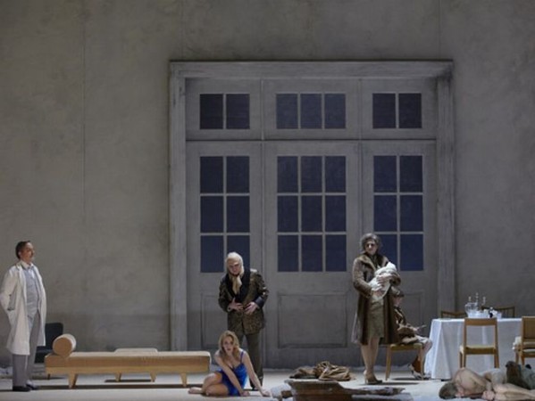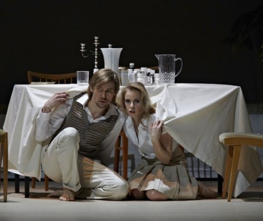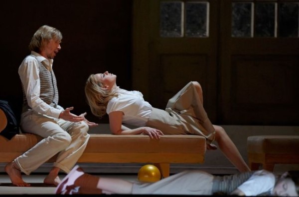 Es ist schon eine ausgeprägte Familienhölle, die die Regisseurin dem Zuschauer hier nachhaltig vor Augen führt. Das einzige Clanmitglied, das es in diesem Inferno nicht mehr aushält, ist der reichlich infantil und ängstlich wirkende Pelléas, der mit Rucksack und in Reisekleidung ständig auf Flucht bedacht ist. Er ist genauso ein Außenseiter wie das Zigaretten rauchende Partygirl Mélisande, die ihre zu Beginn noch recht legere Kleidung samt Sonnenbrille zwar rasch mit einem ihrer neuen Stellung als Golauds Frau eher entsprechenden schicken Outfit vertauscht und auch mal eine braune Perücke über ihr blondes Haar streift, sich in ihre neue Lebenswelt aber in keinster Weise einfinden kann. Diese Messaliance kann nicht gut gehen. Das wird zunehmend auch Golaud bewusst, dem es nicht gelingt, seine Frau innerlich an sich zu binden und seine Zuflucht deshalb in Gewalttätigkeiten sucht. Neben solchen Freud’schen Ersatzhandlungen ist er zunehmend auch auf äußere Bindungszeichen fixiert, wie beispielsweise den dramaturgisch wichtigen Ehering. Er ist ein Musterbeispiel seines Standes.
