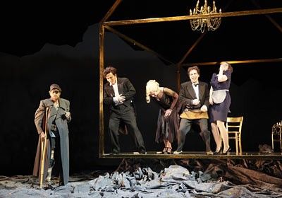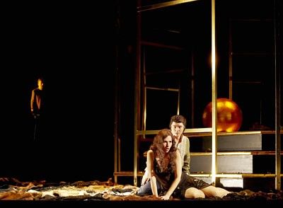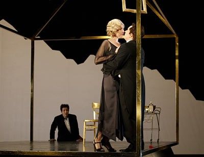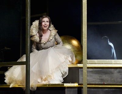 Wesentlich besser hätte man diesen Aspekt mit der blutigen „Violanta“ verknüpfen können, dort werden die Anspielungen auf den Weltkrieg aber komplett ausgespart. Die Bühne zeigt nun eine achteckige Goldkonstruktion, die einen Brunnen und eine große goldene Kugel umgibt, was an das Märchen vom „Froschkönig“ erinnert. Will Trabusch so darauf hinweisen, dass sich Violantas Bild des Prinzen Alfonso verändert, dass er sich vom Frosch, den sie ermorden will, in den Prinzen, den sie liebt, verwandelt? Hier hätte die Regie die Symbolik des Bühnenbildes aufgreifen müssen.