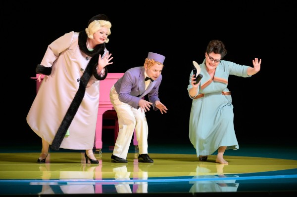 Der Regisseur und Bühnenbildner Herbert Fritsch bleibt beim Bühnenbild fast minimalistisch, indem er nur eine runde Spielfläche und darüber einen übergrossen Lampenschirm im Stil der etwas angestaubten 50ger Jahre zeigt. Als einziges Requisit dienst ein rosaroter Konzertflügel. Auch die Kostüme der Darsteller sind ohne Verzierungen, doch in Bonbonfarben gehalten. Beides gibt dem Visuellen der Inszenierung eine gewisse Plakativität. Auf dieser kommen die Pantomimen, die ausdrucksvoll ausgelebte Körpersprache der Figuren, ja sogar einzelne Slapstickeinlagen, bestens zur Geltung. Der Witz der Handlung und der Sprache wird so noch verstärkt bis er teilweise ins Tragische driftet; wie wir es von grossen Mimen wie Charlie Chaplin kennen. Ganz grossartig dabei ist die junge Sopranistin Flurina Stucki als Christine Storch (Pauline Strauss), die stimmlich und darstellerisch ihre Rolle leben lässt.