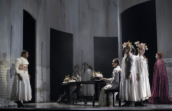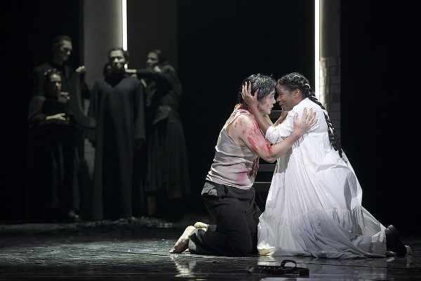 Es wirkte nahezu wie eine szenische Umsetzung der Handlung in die Welt der Nordmänner, ins legendäre Land von Game of Thrones. Dunkel gekleidete Gestalten haben das Sagen und die helle, sklavisch anmutende, Kleidung tragen die Gefangenen. Eine von denen ist Aida. Eine düstere, oft mit drastischen Mitteln versehene, Inszenierung der Verdioper, die am vergangenen Samstag ihre Premiere im Theater Bielefeld hatte. Regisseurin Nadja Loschky erzielte durchaus berührende Momente in dieser Welt voller Gewalt, Hass und Eifersucht, aber manches blieb auch im Dunkeln der Drehbühne verborgen. Zu den berührenden Momenten gehörte ganz sicher das Ende der ersten Szene, in denen eine großartige Elizabeth Llewellyn in der Titelpartie als zerrissene Frau zwischen den Welten verzweifelt ihr „Numi, pietà del mio soffrir!“ gesungen hat.