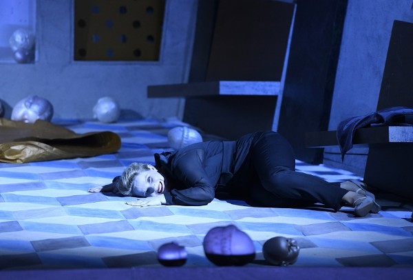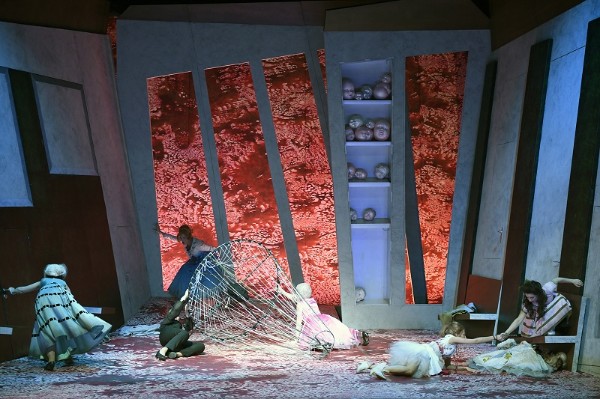 Der Regieansatz von Andrea Schwalbach thematisiert die Gegensätzlichkeit der selbstbestimmten Ariane-Figur und der übrigen Frauen Blaubarts, die sie von Nanette Zimmermann wie abgeranzte Barbiepuppen im Stil der 50er Jahre mit Petticoats und Turmfrisuren ausstaffieren lässt. Zimmermann zeichnet auch für die schiefen Bühnenaufbauten verantwortlich, die sich im dritten Akt in eine Art überdimensionalen Käfig verwandeln, ein toller Effekt. Herzog Blaubart wird schon im Libretto zur Nebenfigur, Andrea Schwalbach macht ihn nun gänzlich überflüssig, obwohl sie ihm, der da eigentlich nur als Stimme auftaucht, im ersten Akt eine Omnipräsenz gibt, die sie aber nicht mit Bedeutung füllt. Vielmehr wird die Figur, die in Bielefeld absolut nicht bedrohliches oder Angst einflößendes hat, eher zum Waschlappen – und die Furcht der Barbie-Frauen vor ihm absolut nicht nachvollziehbar. Sehr schön wiederum visualisiert die aus Frankfurt stammende Regisseurin Arianes Bemühungen, die Frauen von ihrem Puppendasein zu befreien. Die wiederum fühlen sich ohne Ketten und Make-Up nackt und versuchen im Gegenzug, die mit Hosenanzug und Kurzhaarfrisur betont selbstbewusst auftretende Ariane optisch in ein liebes Frauchen zu verwandeln. Dass Schalbach den zweiten Akt so wenig düster zeichnet, ist schade. Denn gerade das Obskure beim der Annährung dieser beiden Lebensentwürfe, das sich auch in der Musik Dukas‘ widerspiegelt, die wesentlich leiser daher kommt als in den beiden anderen Akten, wird so von Anfang an in gleißendes Licht gezerrt. Im letzten Bild schließlich verliert sich Schwalbach im Symbolismus, neigt dann zu wenig klarer Personenführung und Ariane scheint dabei gar nicht zu bemerken, dass ihre treue Amme nun ebenfalls die Gefolgschaft verweigert und auch lieber in Blaubarts Gefängnis zurückbleibt.