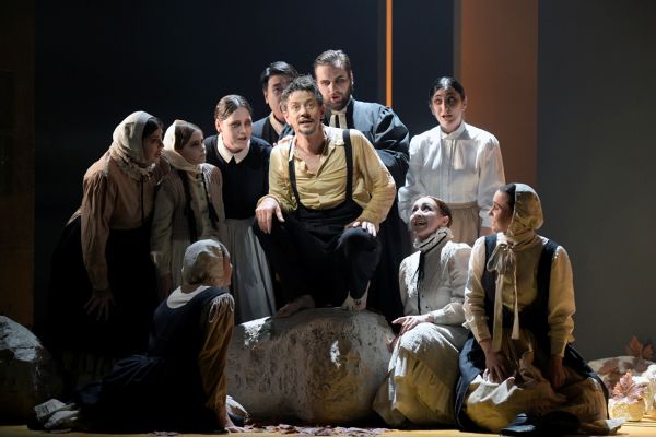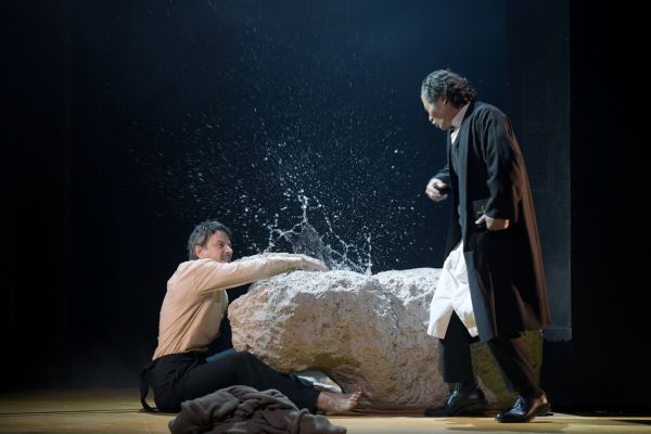 Unterstützt wird die Regie auch durch den gelungenen Kontrast zwischen den historisierenden Kostümen von Irina Spreckelmeyer und dem abstrakten Raum von Ulrich Leitner, der aus einem Zylinder mit großen Türen besteht, vor dem mehrere große Steine liegen.