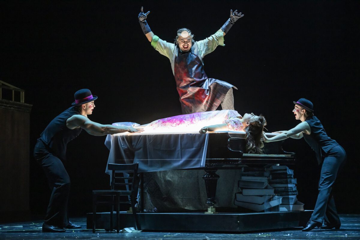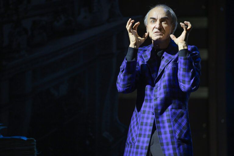 Die Tote kann ihre Position nicht darstellen, nur der mutmaßliche Täter und einige Zeugen beschreiben und erleben ihre Erinnerungen an das Opfer. So liefert Dietrich Henschels Darstellung des Maestro Salvatore das perfekte Portrait eines etwas verschrobenen Pygmalion, der buchstäblich den Verstand verliert, als sein Geschöpf sich emanzipieren und sein Haus verlassen will. Dabei ist seine Zuneigung, ja Besessenheit von ihr, keusch und rein, denn sie stirbt als Jungfrau. Henschel ist ein Bariton der Sonderklasse und hat in Bonn 2023/24 als Moses in „Moses und Aron“ die von Schönberg auf Tonhöhen notierte Sprechpartie des Moses bravourös gemeistert. Er gilt international als Spezialist für moderne und zeitgenössische Oper, der eng mit Komponisten wie Wolfgang Rihm, Hans Werner Henze und Helmut Lachenmann zusammenarbeitet. Er wird international geschätzt für seine intensive Textausdeutung und Bühnenpräsenz, die er auch als Maestro Salvatore bewies.