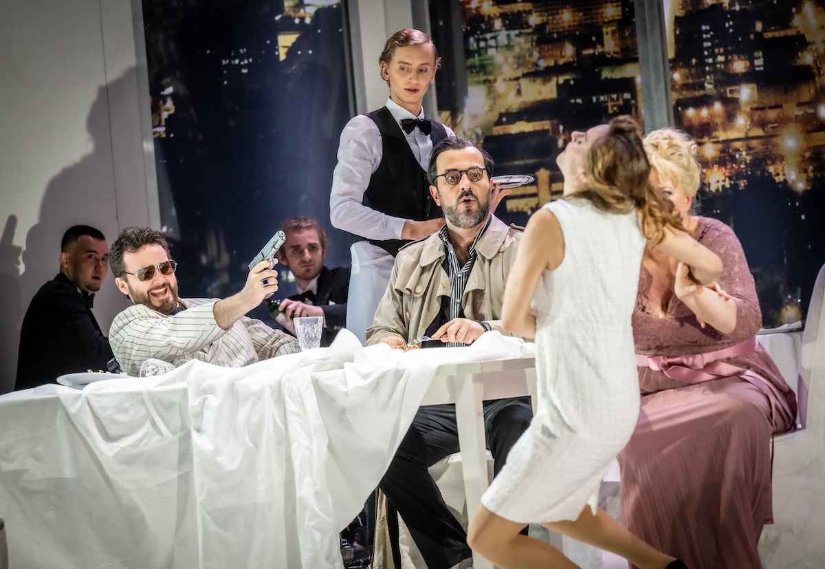Die Grundüberlegung der Regie, es sei frauenverachtend, dass die weiblichen Charaktere von den Männern in diesem Werk zu Gebährmaschinen degradiert werden, dass suggeriert wird, dass sie ihr Heil nur im Kinderkriegen finden, nicht ganz falsch, aber auch etwas kurz gegriffen, denn die Menschlichkeit der Kaiserin offenbart sich im Ende ja in ihrem Verstehen, in ihrem Mitgefühl. Eine Frau werde – so überspitzt es die Regie – erst zum Menschen durch die Gabe Kinder empfangen zu können. Konwitschny verdreht das Stück nun aber so, dass dieser Geschlechterkonflikt zum Dreh- und Angelpunkt einer absurden Story wird, die zwischen Genlabor, Restaurant und Mafia angesiedelt ist. Keikobad und der Kaiser sind rivalisierende Mafia-Bosse, Barak und sein Weib betreiben ein Genlabor, und die Amme ist ganz vieles zugleich: Putzfrau, Therapeutin, Babysitterin. Ja, das klingt schon krude, aber ganz wild wird es, wenn sich die Damen immer wieder Kissen unters Kleid stecken und so eine Schwangerschaft andeuten, wenn Barak im Krankenhausbett minutenlang von links nach rechts über die Bühne gefahren wird und am Ende alle Frauen tot sind. Als Publikum fühlt man sich immer wieder mit einer Bilderflut konfrontiert, die man über weite Strecken nicht so recht zusammenbringen kann, weil sie wenig plausibel sind. Immer wieder greift die Regie tief in die Klischeekiste: Selten staksten Prostituierte dermaßen prostituiert über die Bühne, es gibt ein Mafiamillieu wie im „Paten“, Rumgeballer, schlechten Bühnensex – all das ist dabei so wahnsinnig bieder und altbacken erzählt, dass es einen schüttelt. Gewürzt wird dies noch mit humoristischen Einlagen, welche die Figuren teilweise unfassbar klein machen, wie z.B. ein eingefügter, kurzer Dialog am Ende des ersten Aktes, in dem Barak und sein Weib sich um ein Radio streiten.